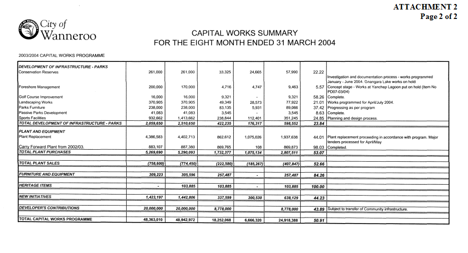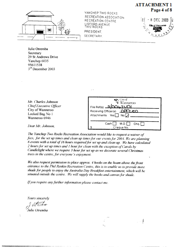 4. APPROVE a donation of $640.05 to the Yanchep Two Rocks Recreation Association for a waiver of fees for the purpose of setting up and cleaning up for the group’s six events for 2004.