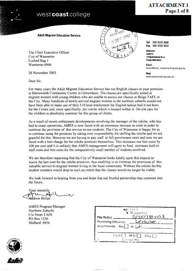 1. NOT APPROVE a request from Adult Migrant Education Services for a waiver of fees for the hire of the crèche facility at the Hainsworth Community Centre.