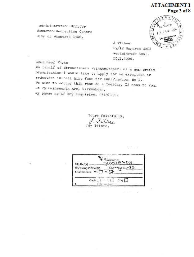 3. NOT APPROVE a donation request from the Streamliners Weight Watchers group for a waiver or reduction of fees for the hire of the Hainsworth Community Centre.