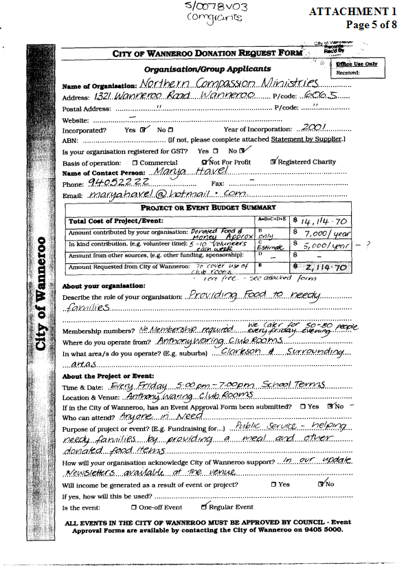5. NOT APPROVE a request from the Northern Compassion Ministries for a waiver of fees for the hire of the Anthony Waring Hall in Clarkson for the provision of food to needy people in the community.