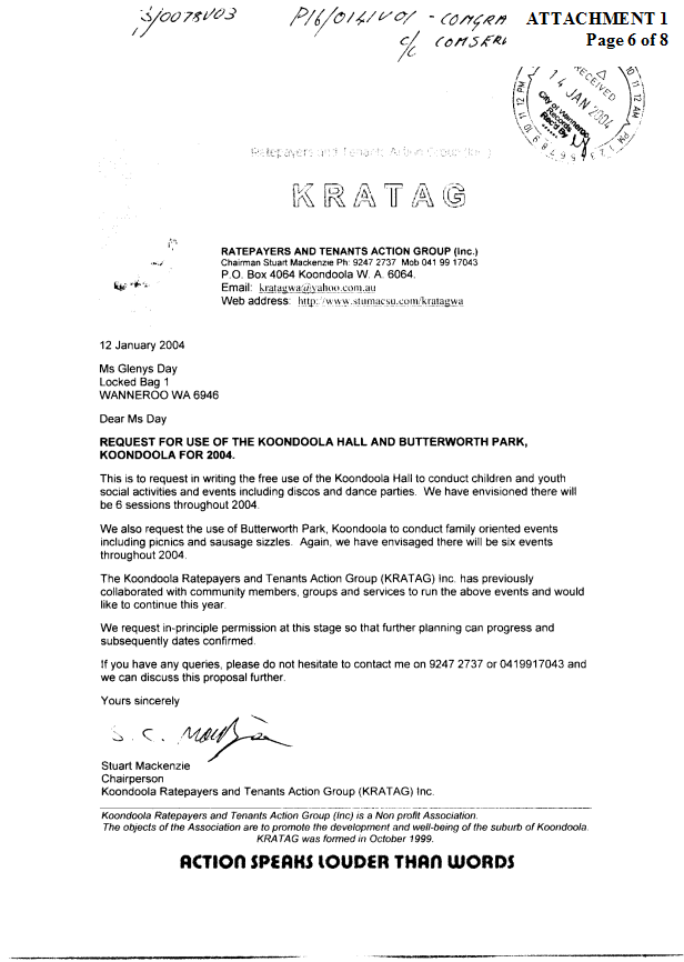 6. APPROVE free use of the Koondoola Hall to the Koondoola Residents and Tenants Action Group for events for young people throughout 2004 and a waiver of fees up to $90 for the use of Butterworth Park for the groups activities.