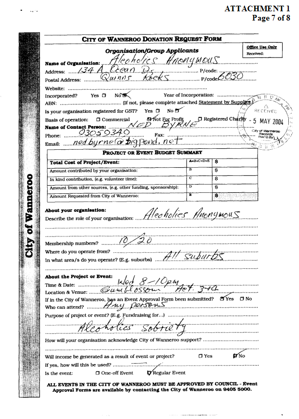 7. APPROVE a donation of $816.40 to the Alcoholics Anonymous group of Quinns Rock for a reduced hire rate for the Gumblossom Community Hall of $8.00 per hour for 2004.