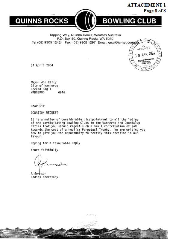 8. NOT APPROVE a donation to the Quinns Rocks Bowling Club of $40.00 towards the purchase of a replica perpetual trophy.