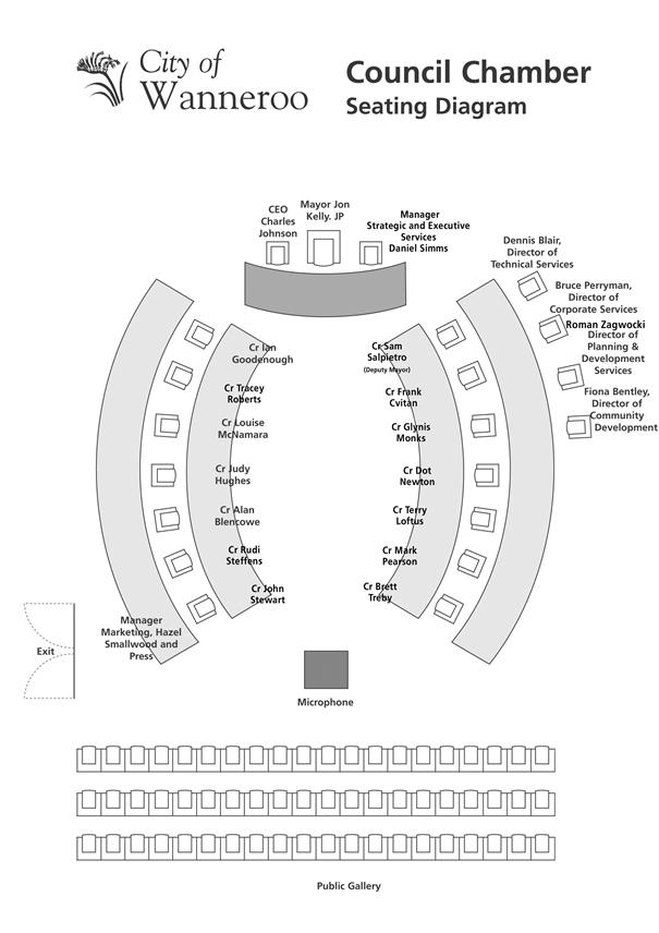 The Mayor and Councillors will conduct an informal session on the same day as the meeting of the Council at the Civic Centre, Wanneroo, commencing at 6.15pm where members of the public may, by appointment, present deputations. If you wish to present a deputation please submit your request for a deputation in writing addressed to the Chief Executive Officer or fax through to Executive Services on 9405 5097.