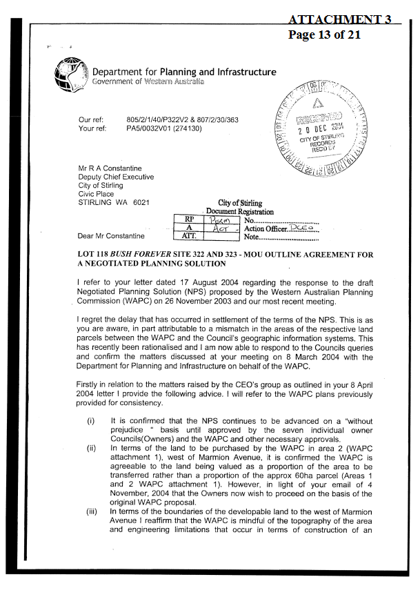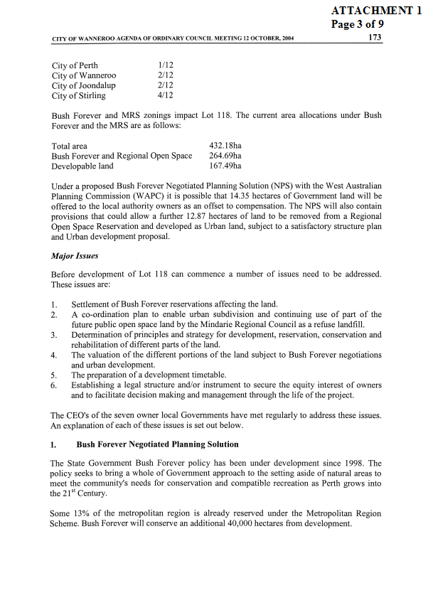4. NOTES the proposals for a Negotiated Planning Solution (NPS) with the West Australian Planning Commission (WAPC) regarding Bush Forever sites 322 and 323 be resolved into an Agreement for endorsement by owner Councils.