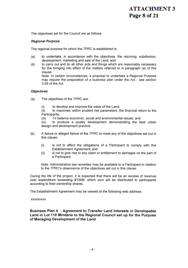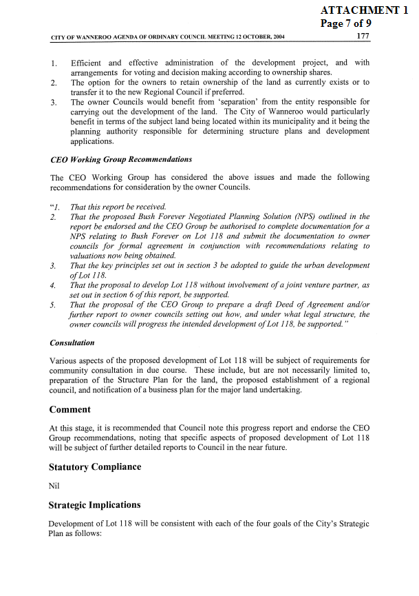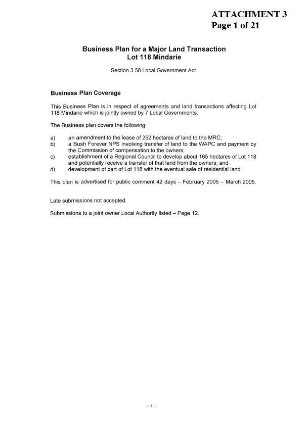 1. ADOPTS the draft Business Plan covering land issues affecting Lot 118 Mindarie, including the establishment of a Regional (Development) Council for approximately 166 hectares of Lot 118, for the purpose of advertising pursuant to Section 3.59 of the Local Government Act.
