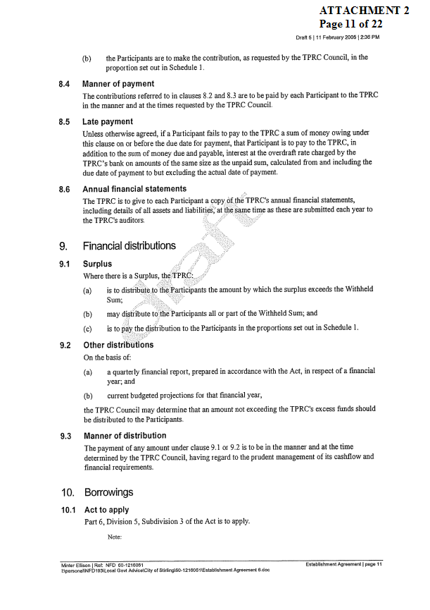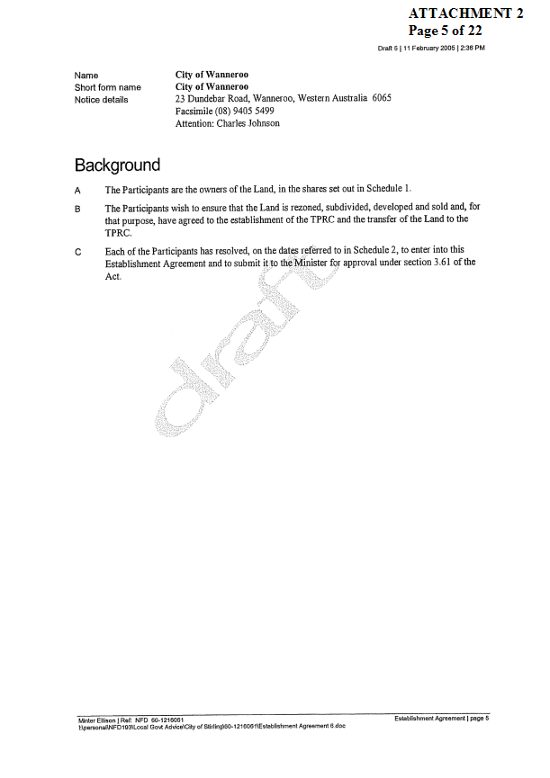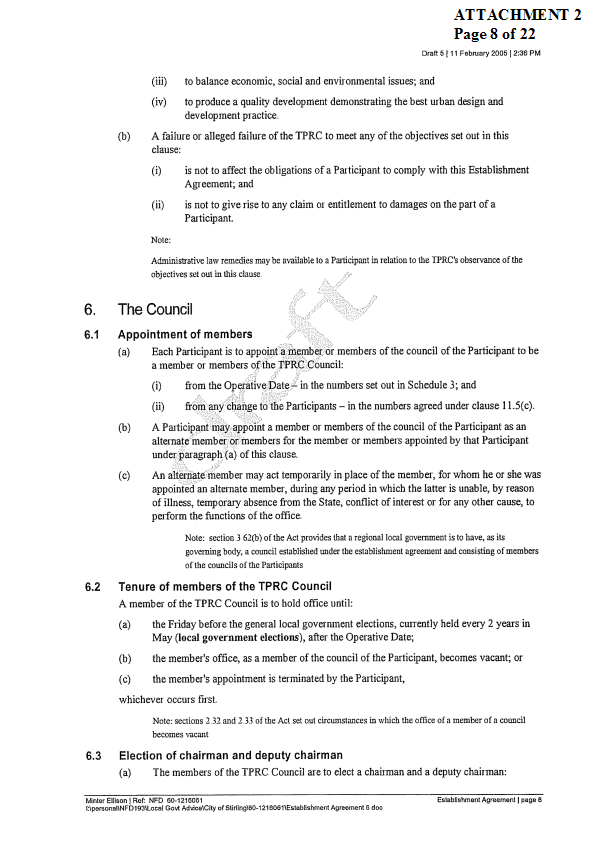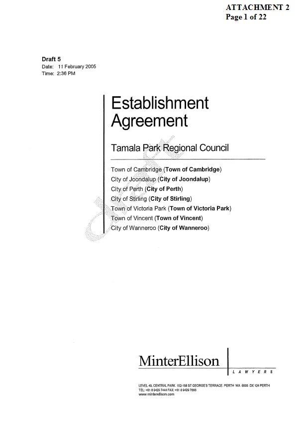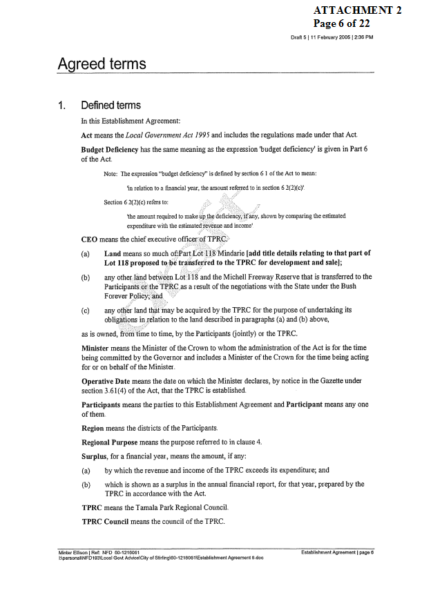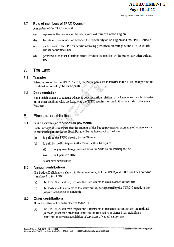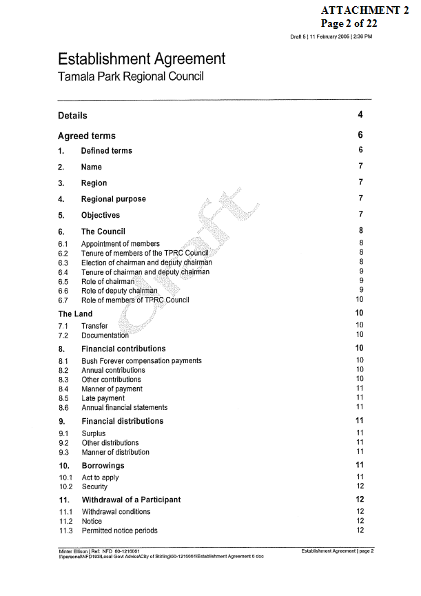 2. APPROVES IN PRINCIPLE the draft Establishment Agreement for the Tamala Park Regional Council (TPRC) subject to a suitable clause being included which requires the TPRC to pay on an annual basis a rate equivalent payment to the City of Wanneroo.