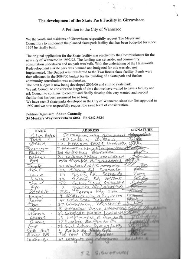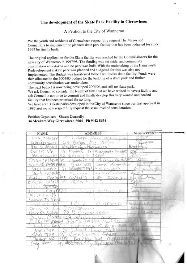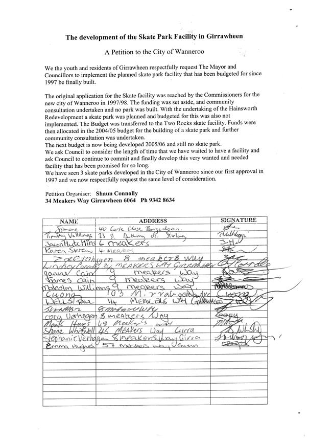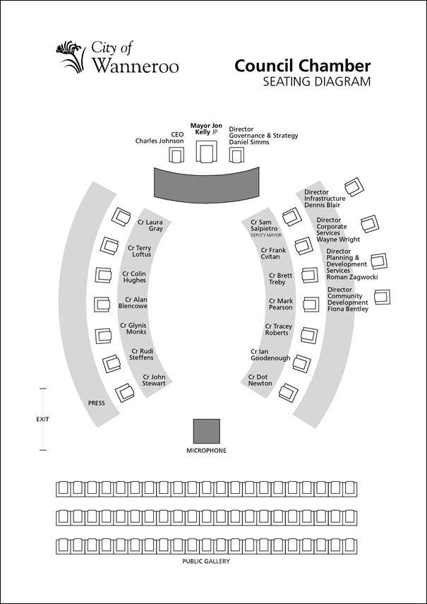 The Mayor and Councillors will conduct an informal session on the same day as the meeting of the Council at the Civic Centre, Wanneroo, commencing at 6.00pm where members of the public may, by appointment, present deputations. If you wish to present a deputation please submit your request for a deputation in writing addressed to the Chief Executive Officer or fax through to Executive Services on 9405 5097.