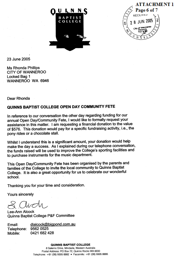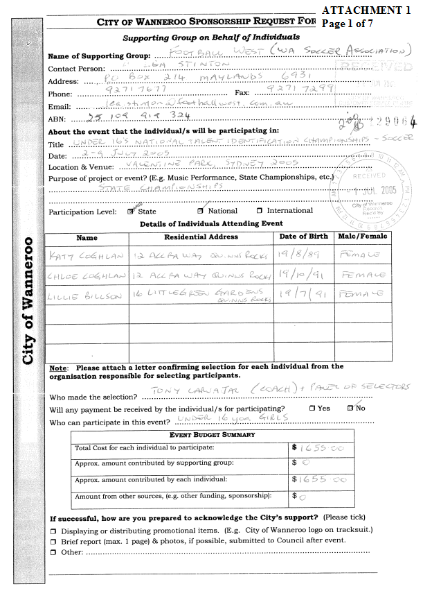 NOT APPROVE a donation to Gymnastics Western Australia for sponsorship of Daria and Natalie Joura to support their participation in the Australian National Gymnastics Championships held in Sydney from 15 – 23 May 2005 |
