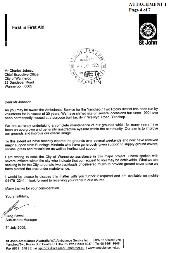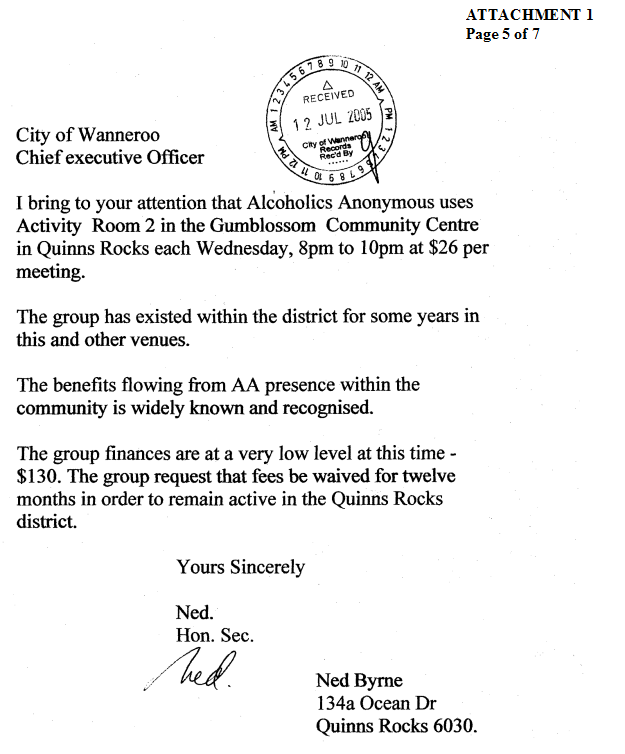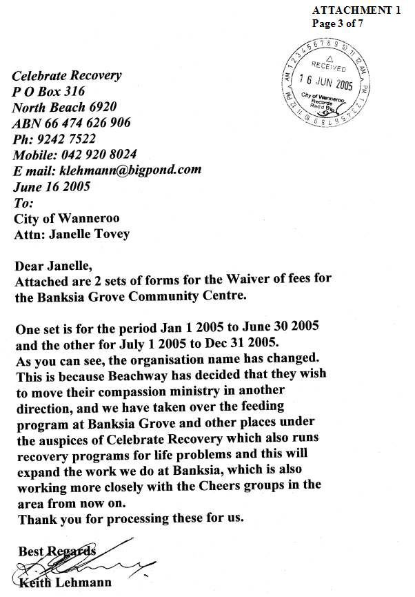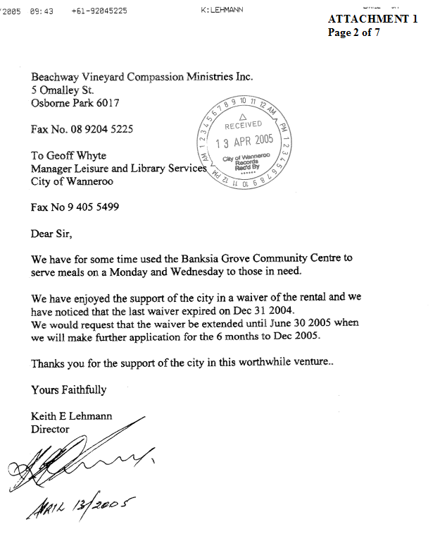 Request for a waiver of fees for the hire of the Banksia Room at the City of Wanneroo Civic Centre to hold the Association’s AGM on the 2 July 2005 |