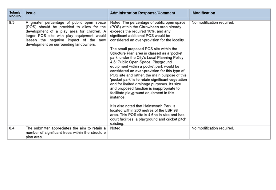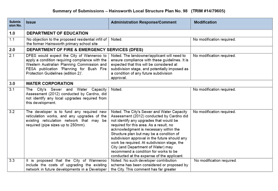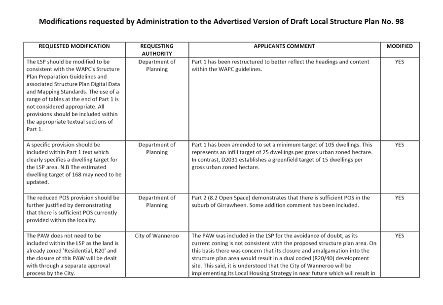 To consider submissions on the proposed Hainsworth Local Structure Plan No. 98 (LSP 98) to determine the modifications required and its acceptability for final approval and forwarding to the Western Australian Planning Commission (WAPC) for endorsement.