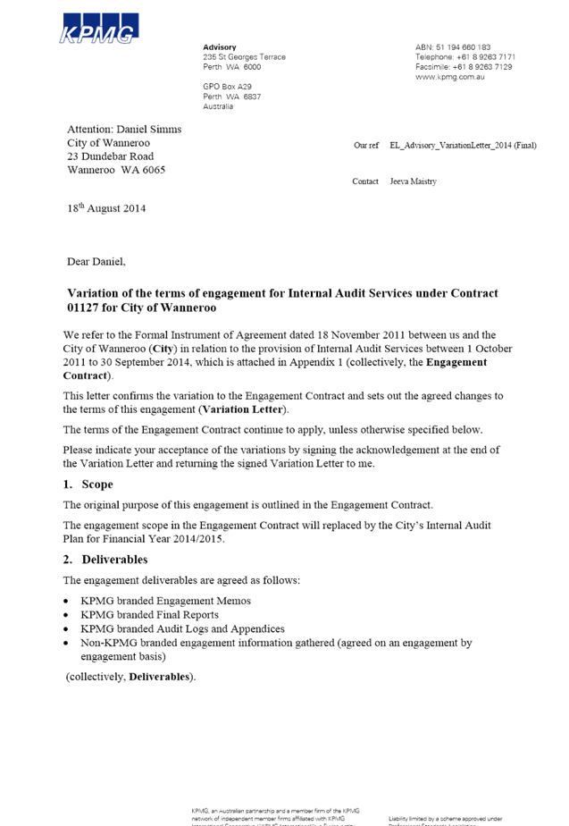 The Chief Executive Officer continues to engage with our key major stakeholders, and appointment to the ICC as the local government representative will achieve one of the goals in the City's recently adopted Advocacy Plan – Region: Collaborative Planning for Major Regional Economic Growth – "Depending on the articulated role of the ICC, include North-West Sub-Region representation on the ICC".