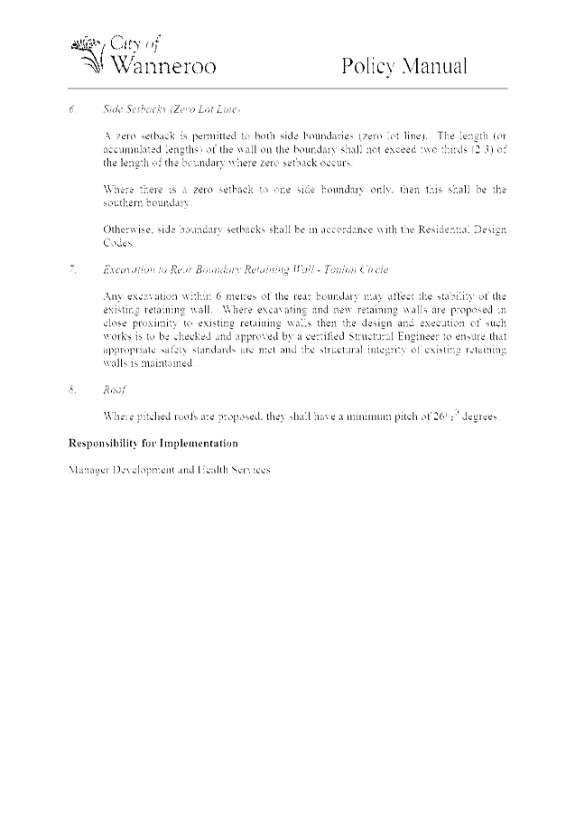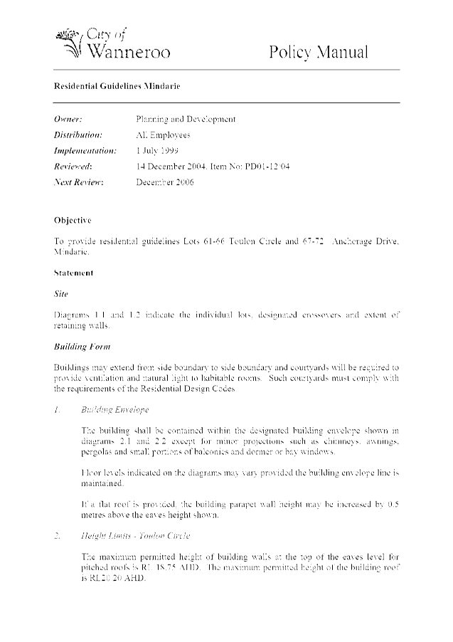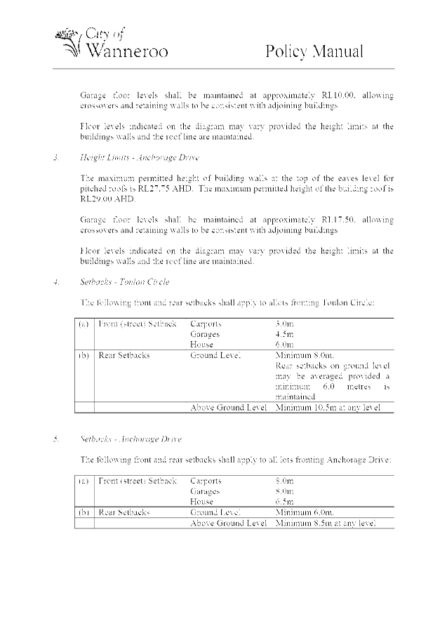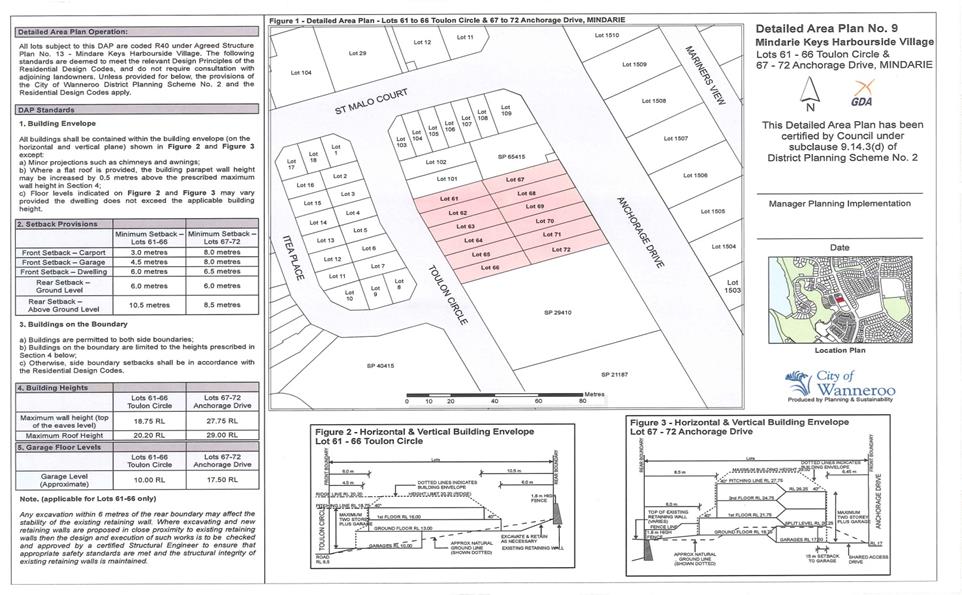 The Policy was initially prepared to provide built form guidelines for residential development on 12 lots located at Lots 61-66 Toulon Circle, Mindarie and Lots 67-72 Anchorage Drive, Mindarie. The extent of the Policy area is shown on the plan included as Attachment 1.