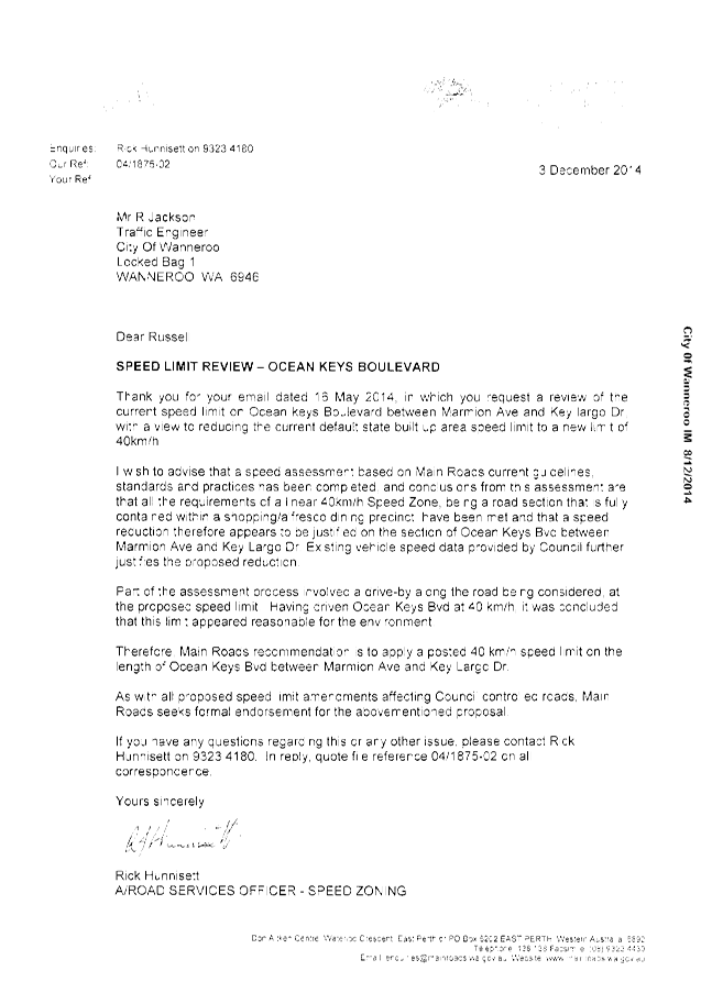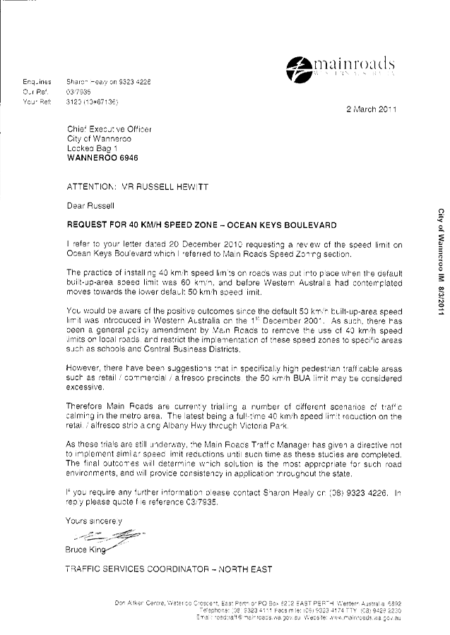 1. NOTES that Administration will continue to monitor the traffic volumes and speeds along Hester Avenue and liaise with Main Roads WA to determine the need for any modifications to intersection layouts other than those proposed at the Hester Avenue/Connelly Drive intersection as part of the Mitchell Freeway Extension Project;