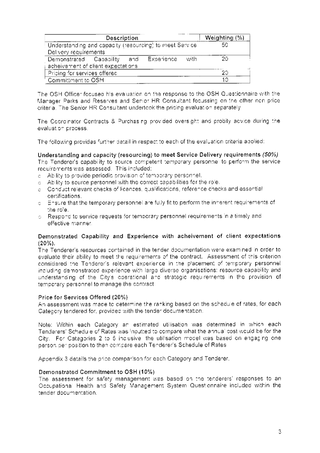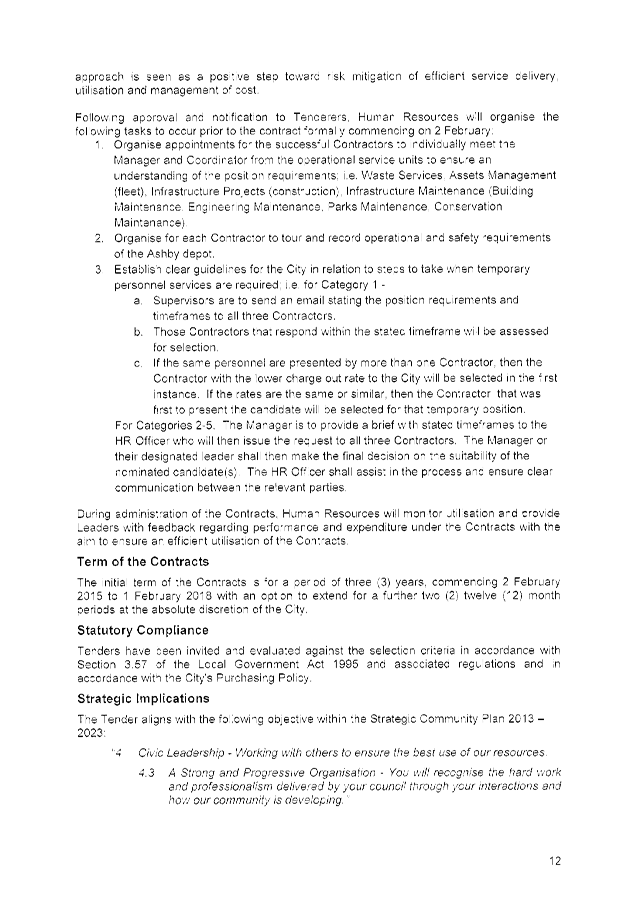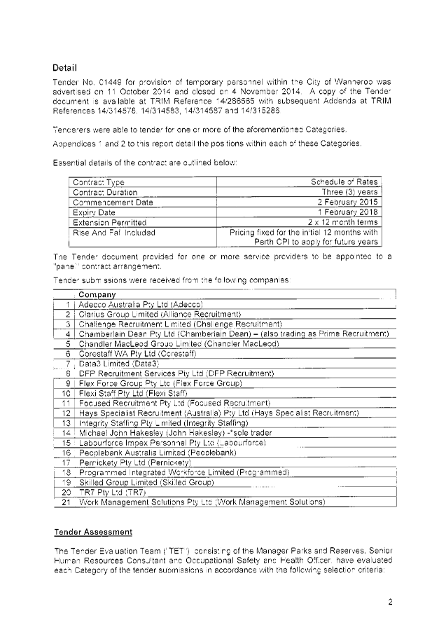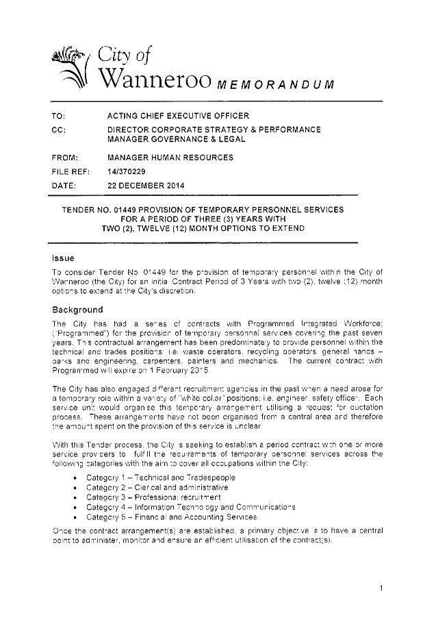 On 22 December 2014, the Acting Chief Executive Officer approved the award of Tender No. 01449 for the provision of temporary personnel within the City of Wanneroo (the City) for an initial Contract Period of 3 Years with two (2), twelve (12) month options to extend at the City's discretion.