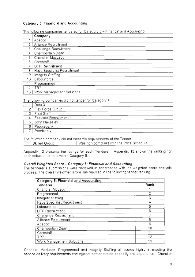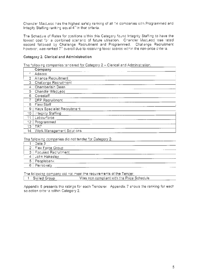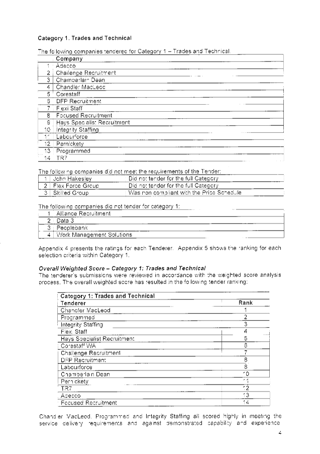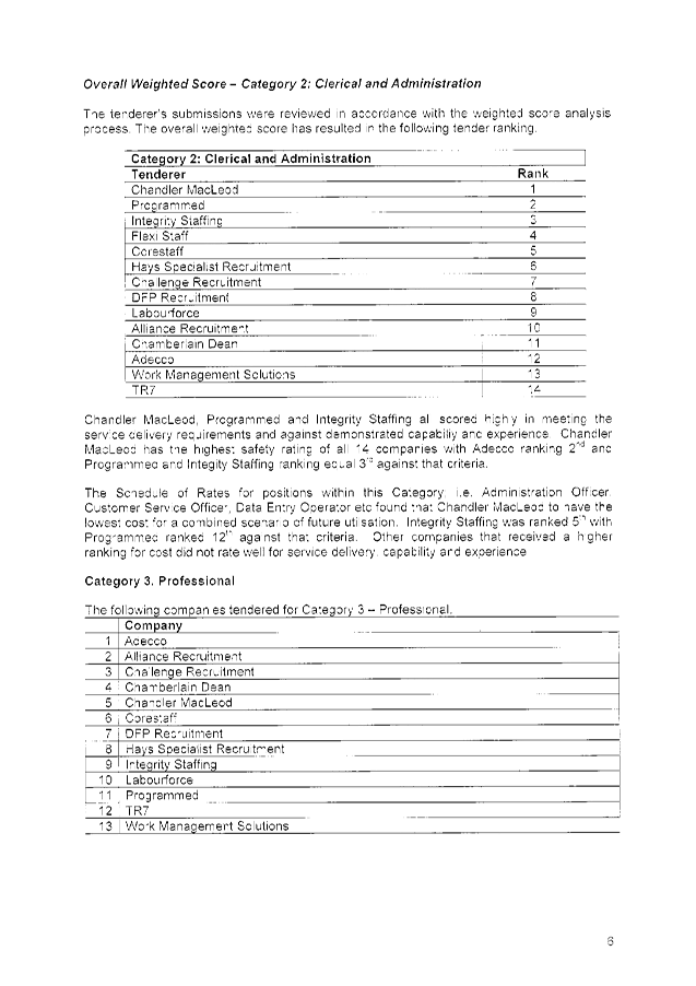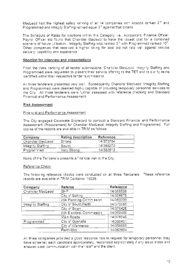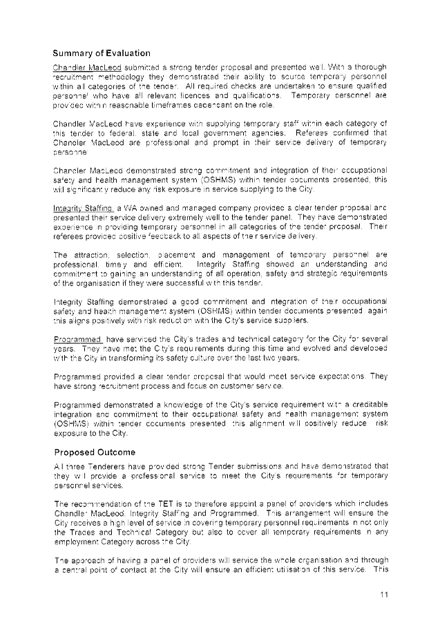 The following tenders were accepted: Chandler Macleod Group Limited, Integrity Staffing Pty Ltd and Programmed Integrated Workforce Limited, for the Provision of Temporary Personnel Services for a period of three (3) years commencing 2 February 2015 with two (2), twelve (12) month options to extend (at the discretion of the City) and on the basis of the schedule of rates provided in each tender submission.