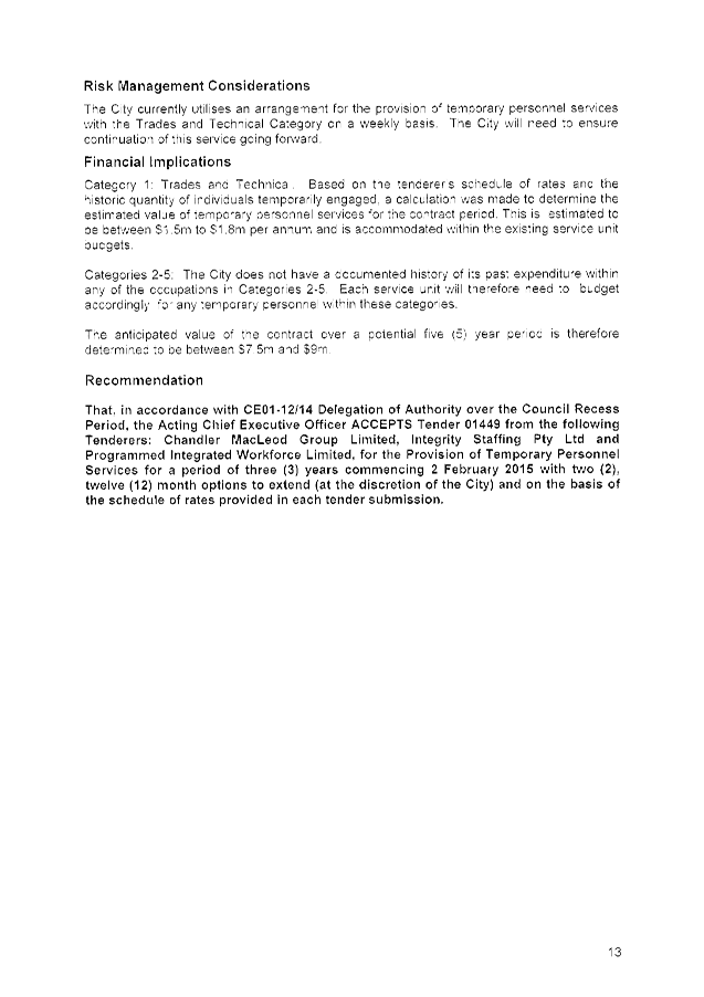 1. DELEGATE BY ABSOLUTE MAJORITY to the Acting Chief Executive Officer the AUTHORITY to ACCEPT one or more Tenders resulting from Tender 01449 – Provision of Temporary Personnel Services for a period of three years with two twelve month options to extend during Councils recess period being from 9 December 2014 to 3 February 2015; and