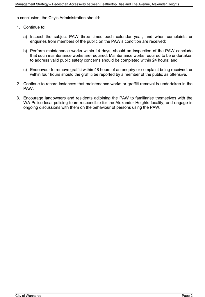 Administration also notes that there have been periodic enquiries from equestrian operators (commercial and non-profit) seeking public land for development. Whilst City staff have assisted with these enquiries, unfortunately the City has little or no land which is suitable for larger scale equestrian purposes. Proposals should typically be directed to the State (where the Department of Biodiversity, Conservation & Attractions has large landholdings, including State forest areas) or to private landholdings which may be available for sale. The City’s current support for the continuation of equestrian uses is currently limited to advocacy, other than the support in providing the equestrian area at Timely Hostess Mews and in continuing peppercorn leases to the Wanneroo Horse & Pony Club (Estrel Park) and the Wanneroo Trotting Club (Nanovich Park).
