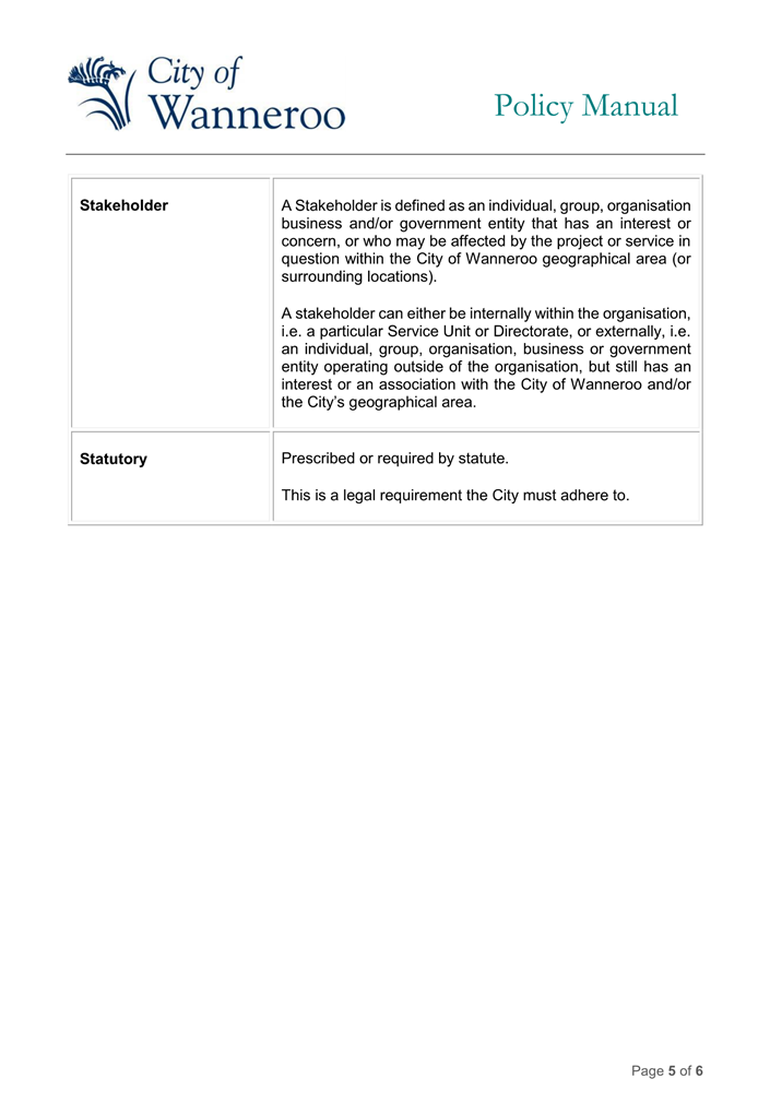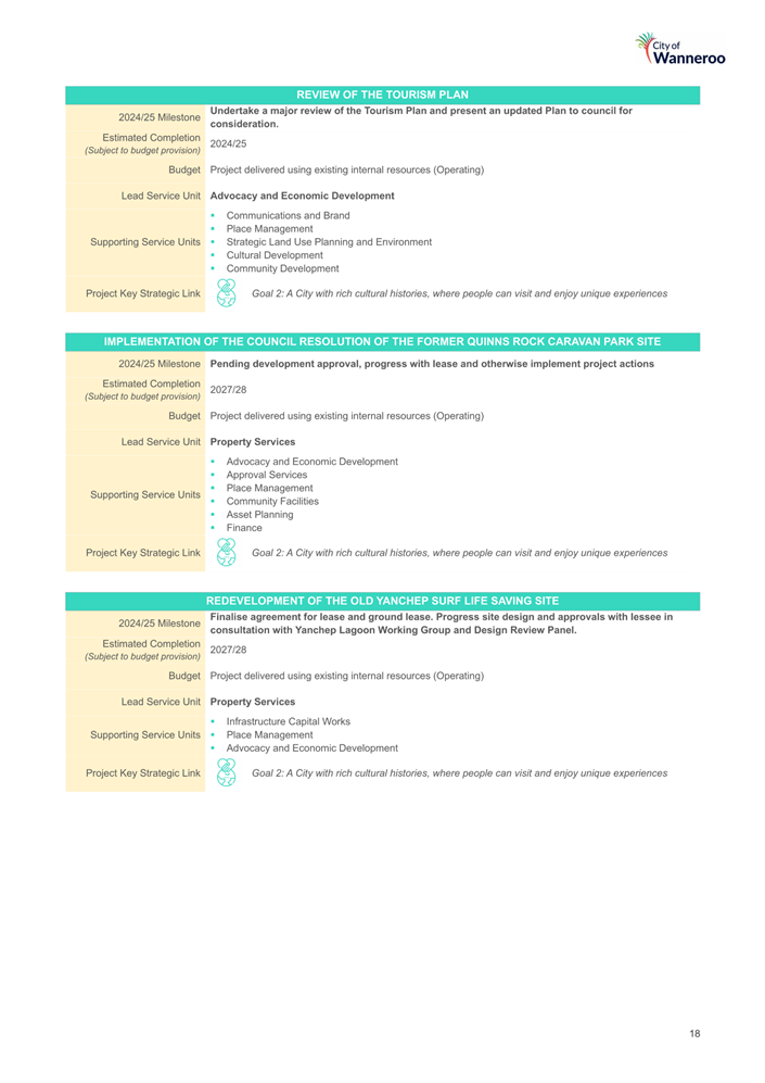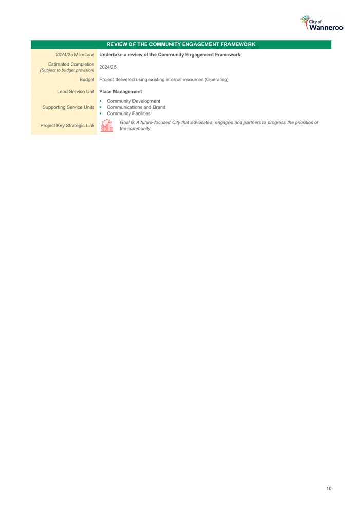 As well as considering the criteria above, integrating existing working groups into an overall Strategic Projects Working Group would need to consider other factors such as the current stage that each project is at and the composition of each working group. In the case of the Quinns Rocks Caravan Park Re-development Working Group, the key functions of the working group are almost complete and therefore there would be limited value in including this in a Strategic Projects Working Group. The Yanchep Lagoon Community Working Group has community representatives, in accordance with its Terms of Reference, as their input is important for the nature of this project. Integrating this working group into a Strategic Projects Working Group would result in the loss of this community input.