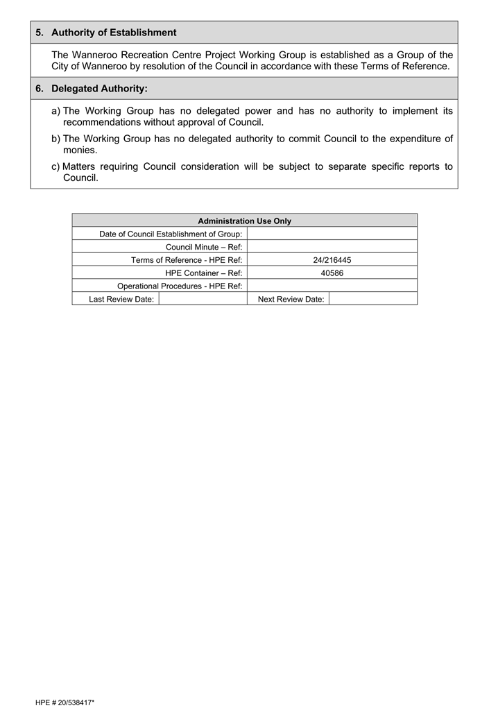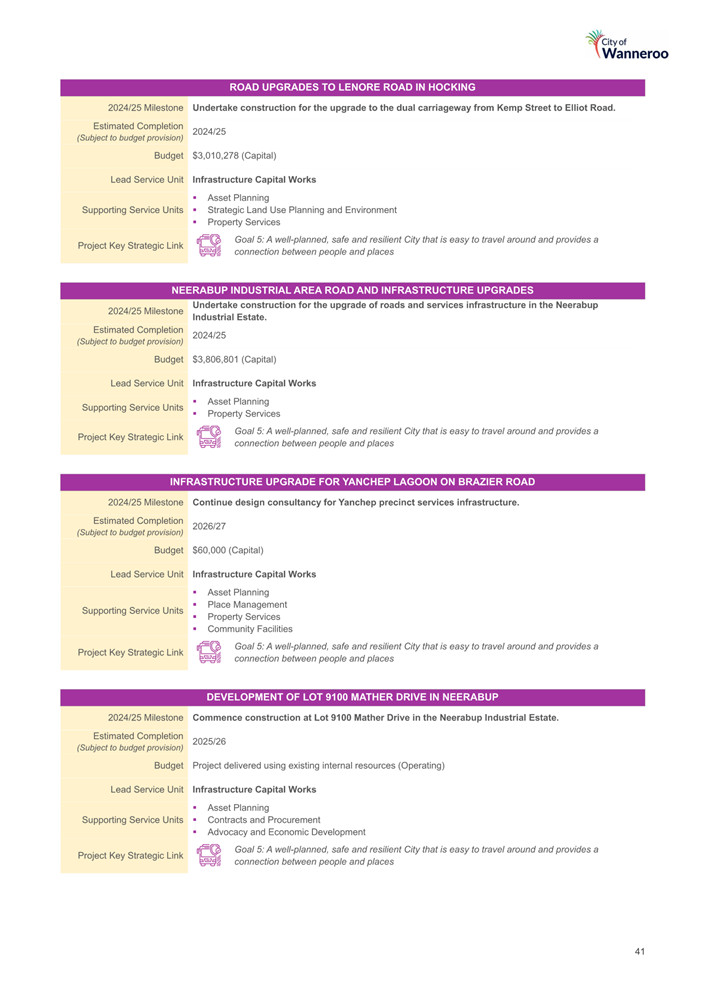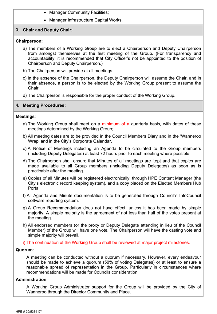 The City of Wanneroo has established working groups under section 5.8 of the Local Government Act 1995 (Act) with Council Members as delegates, these working groups having responsibility for individual Infrastructure Capital Works projects including: