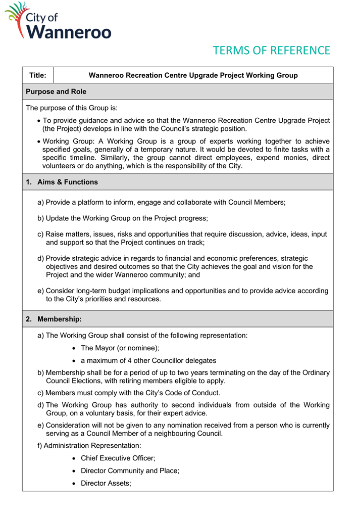 This proposal incorporates and reflects feedback provided by Council Members to the proposed establishment of the Wanneroo Recreation Centre Upgrade Project Working Group.
