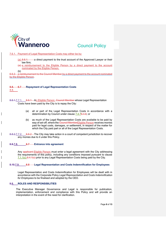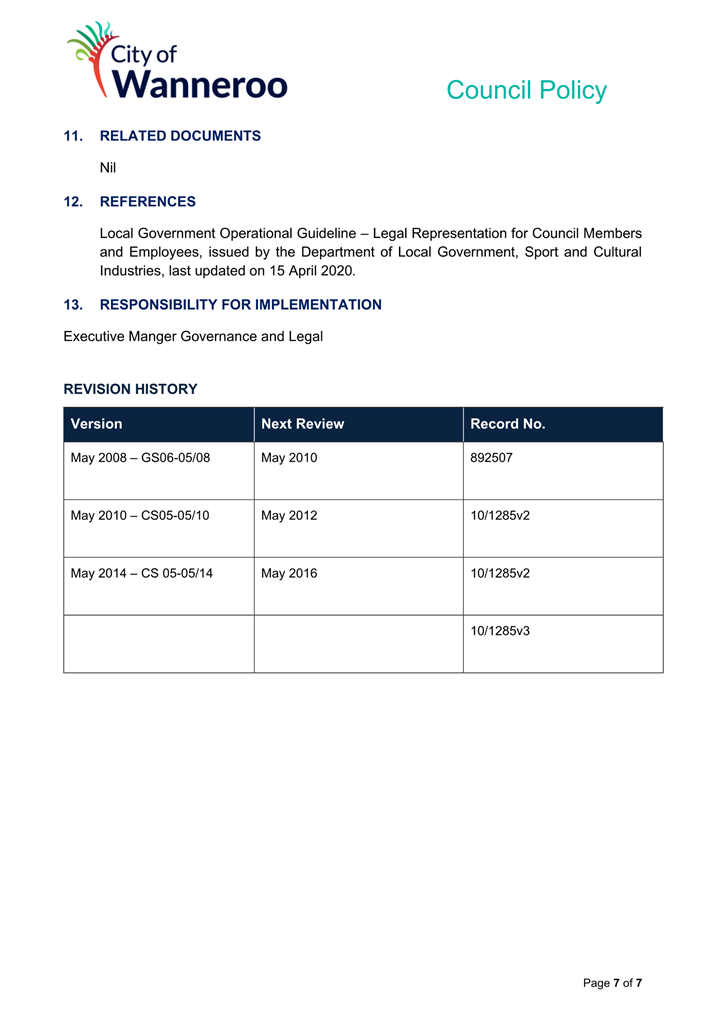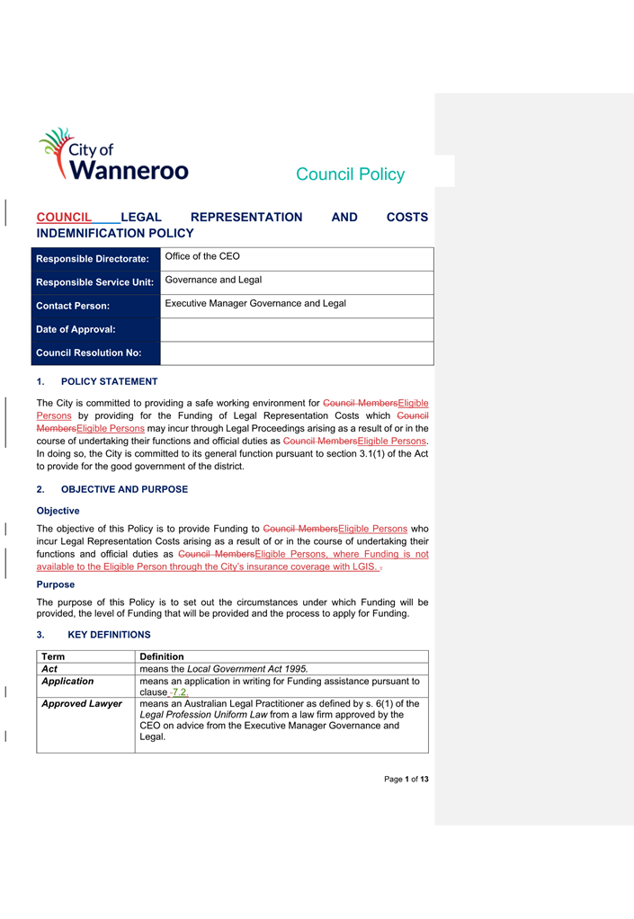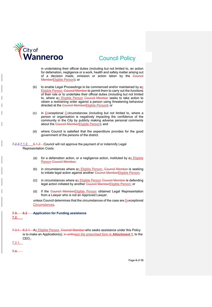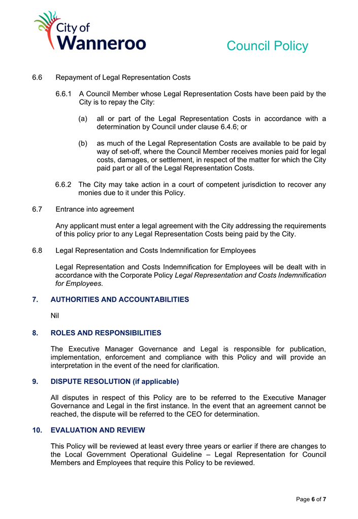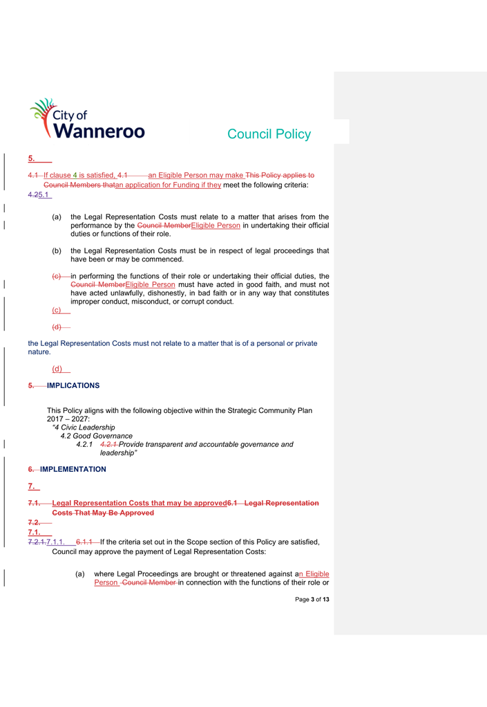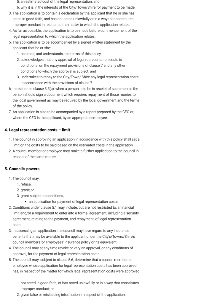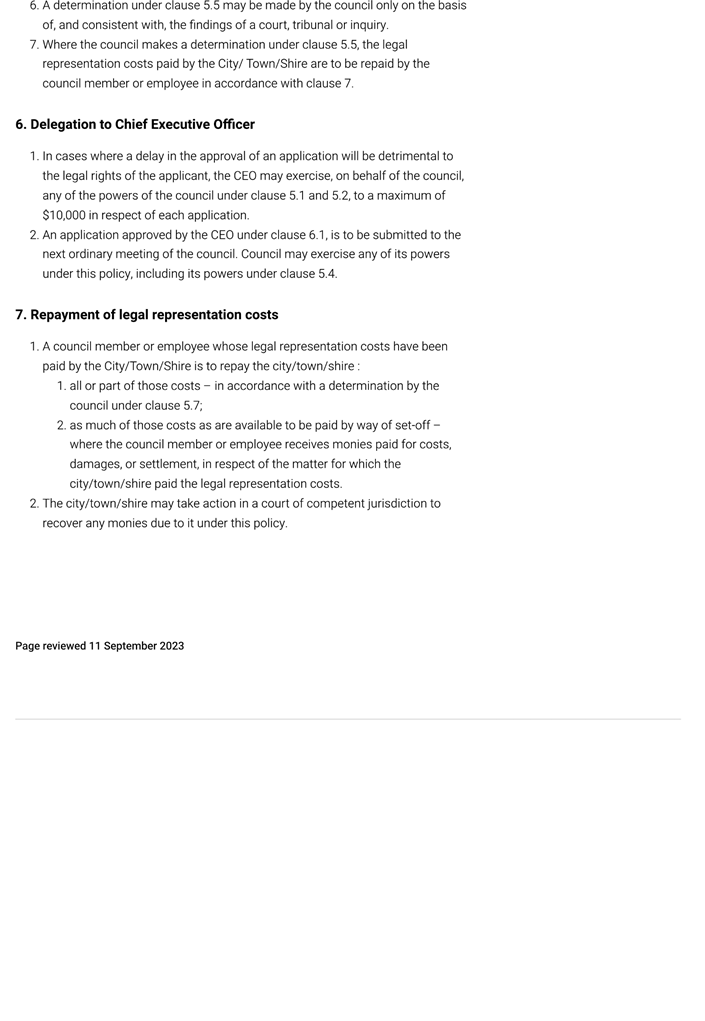 6. Removed references to the legal representation and costs indemnification of Council Employees, who will be dealt with under a separate Corporate Policy. This is a departure from the Model Policy, on the basis that the CEO is the decision-maker in respect of employee matters and is consistent with the CEO’s functions under section 5.41(d) and (g) of the Act.