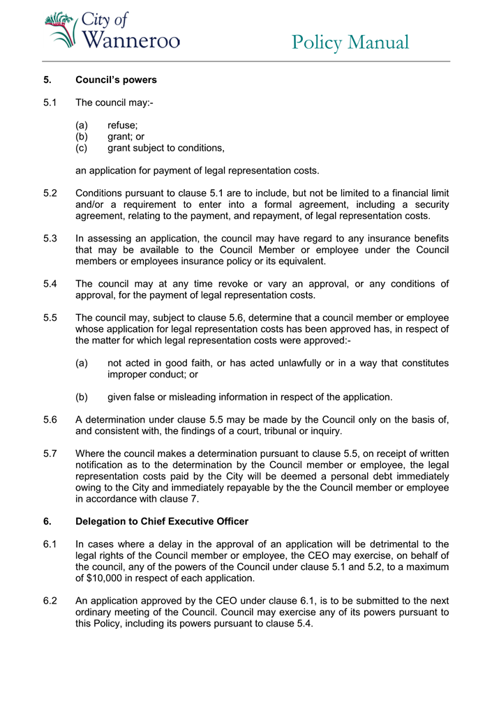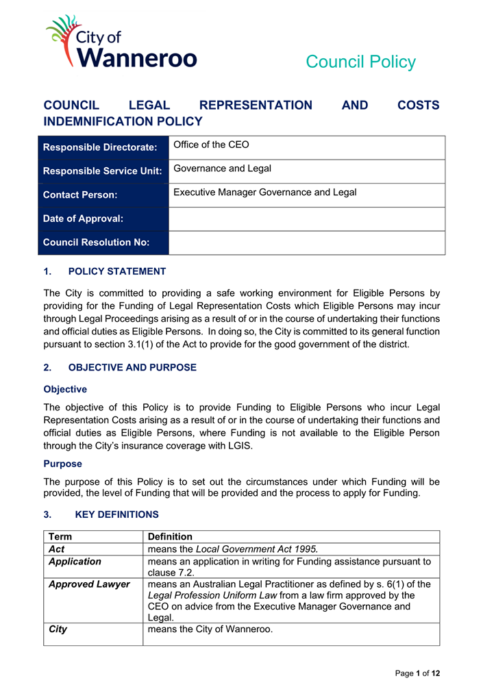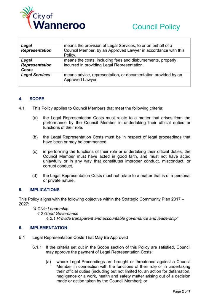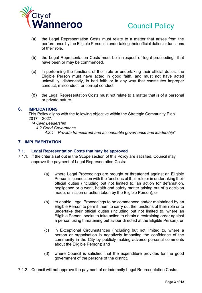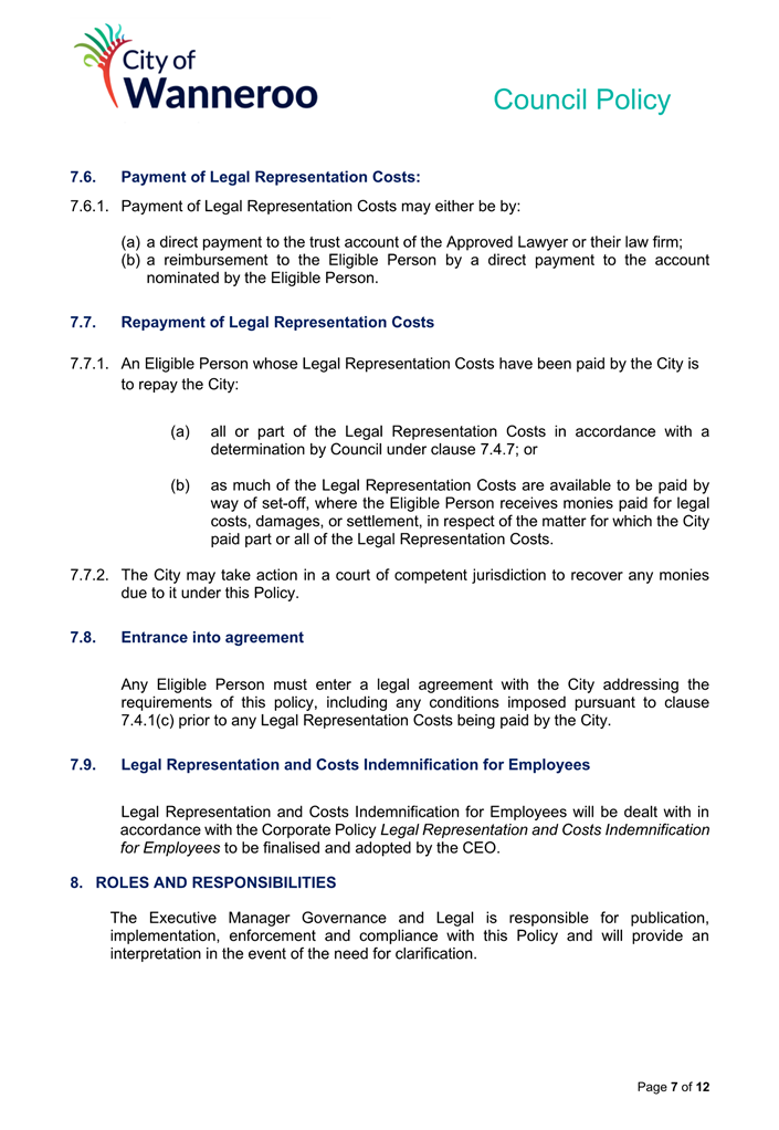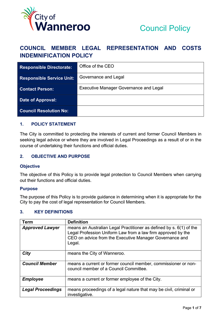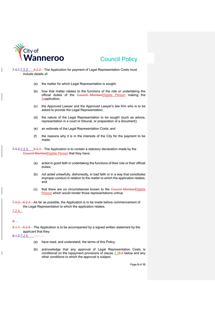 6. Removed references to the legal representation and costs indemnification of Council Employees, who will be dealt with under a separate Corporate Policy. This is a departure from the Model Policy, on the basis that the CEO is the decision-maker in respect of employee matters and is consistent with the CEO’s functions under section 5.41(d) and (g) of the Act.
