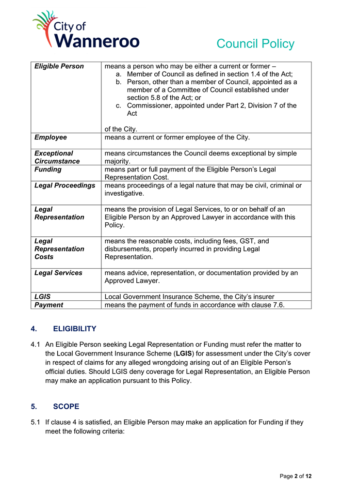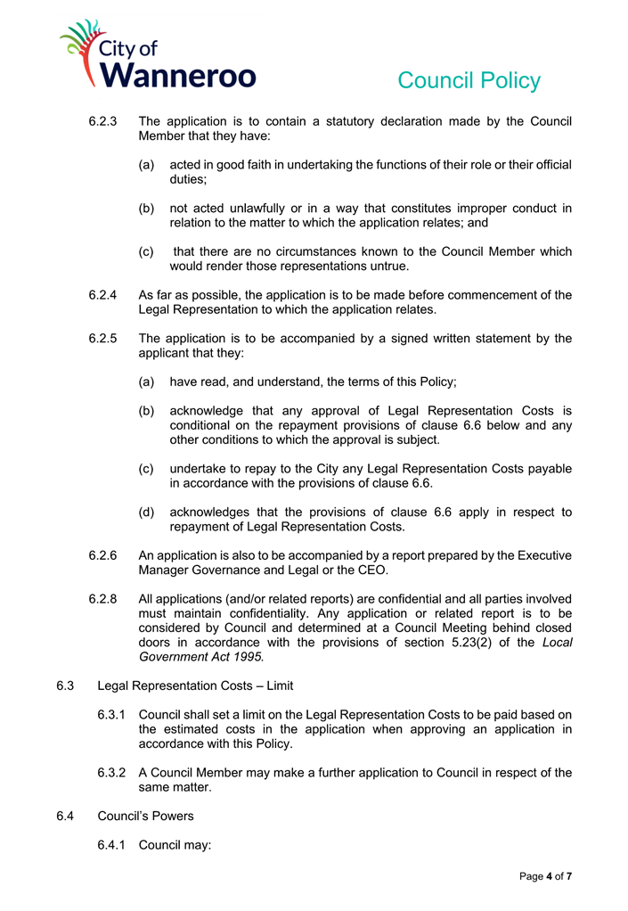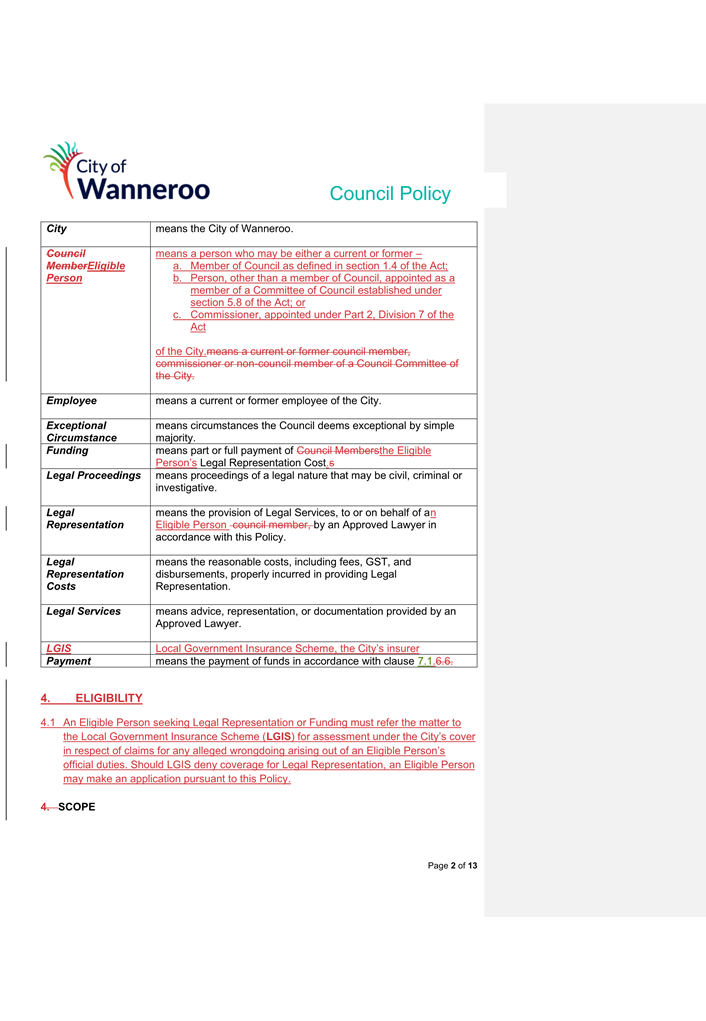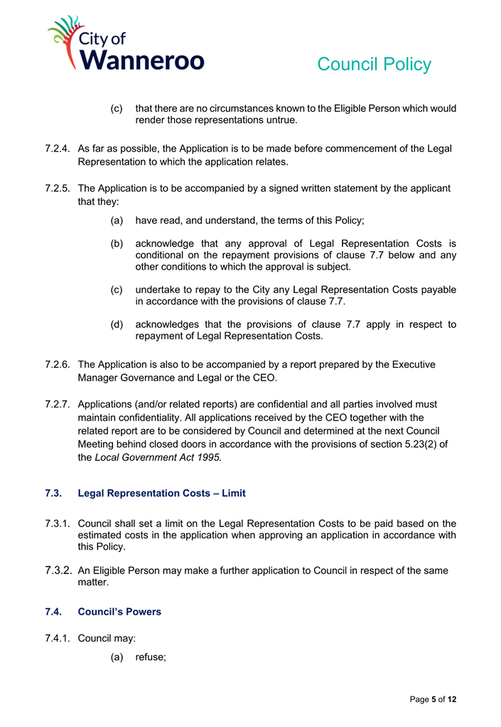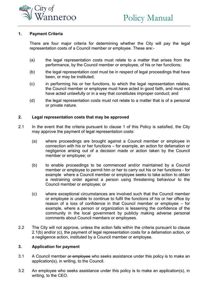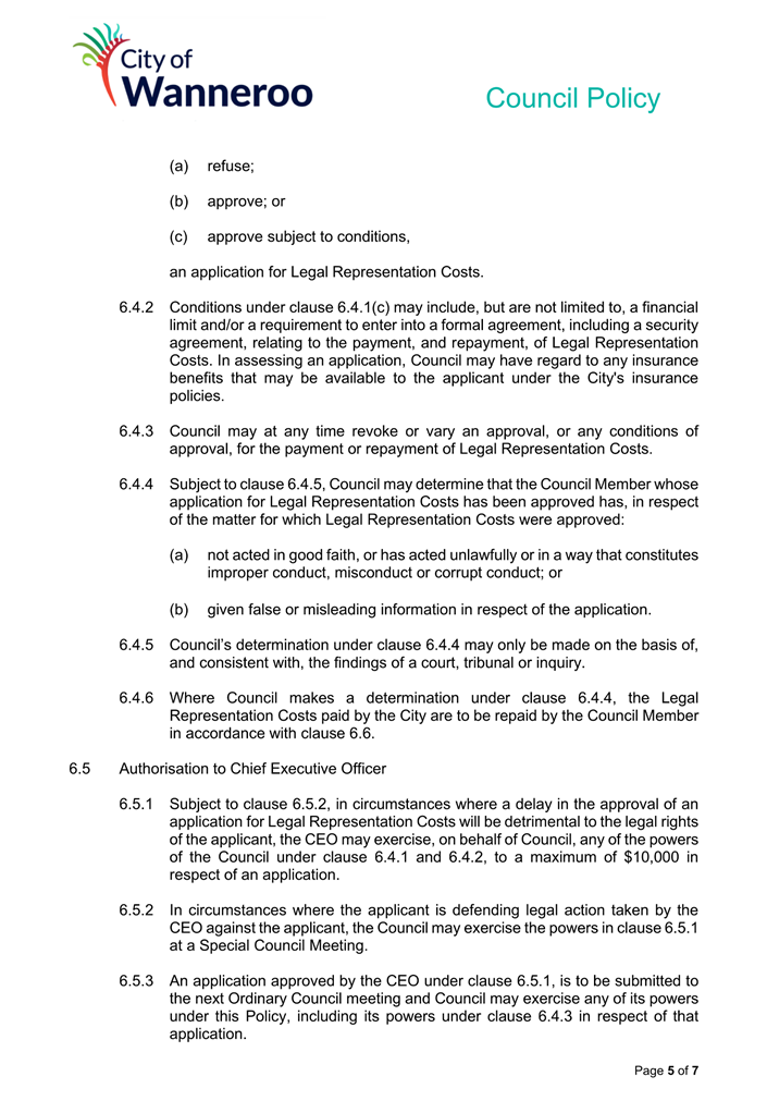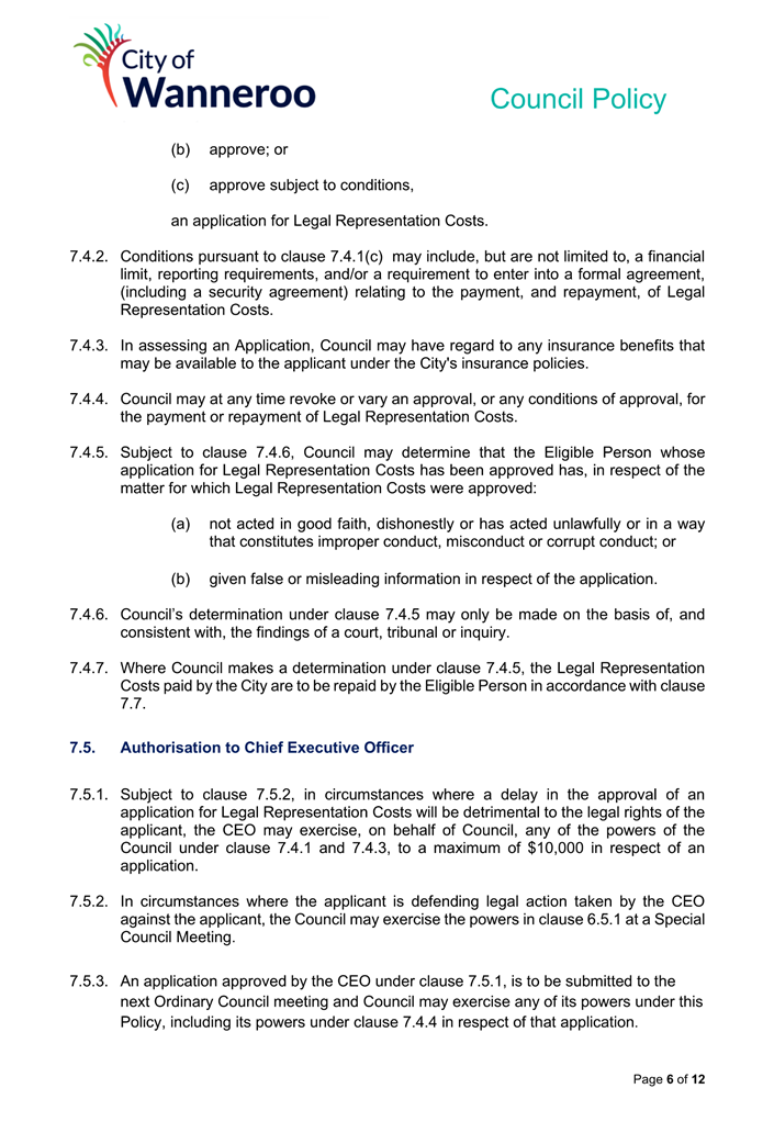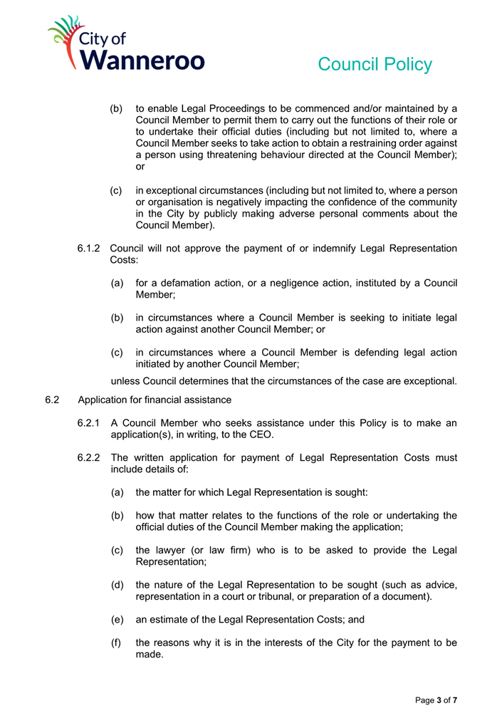 6. Removed references to the legal representation and costs indemnification of Council Employees, who will be dealt with under a separate Corporate Policy. This is a departure from the Model Policy, on the basis that the CEO is the decision-maker in respect of employee matters and is consistent with the CEO’s functions under section 5.41(d) and (g) of the Act.