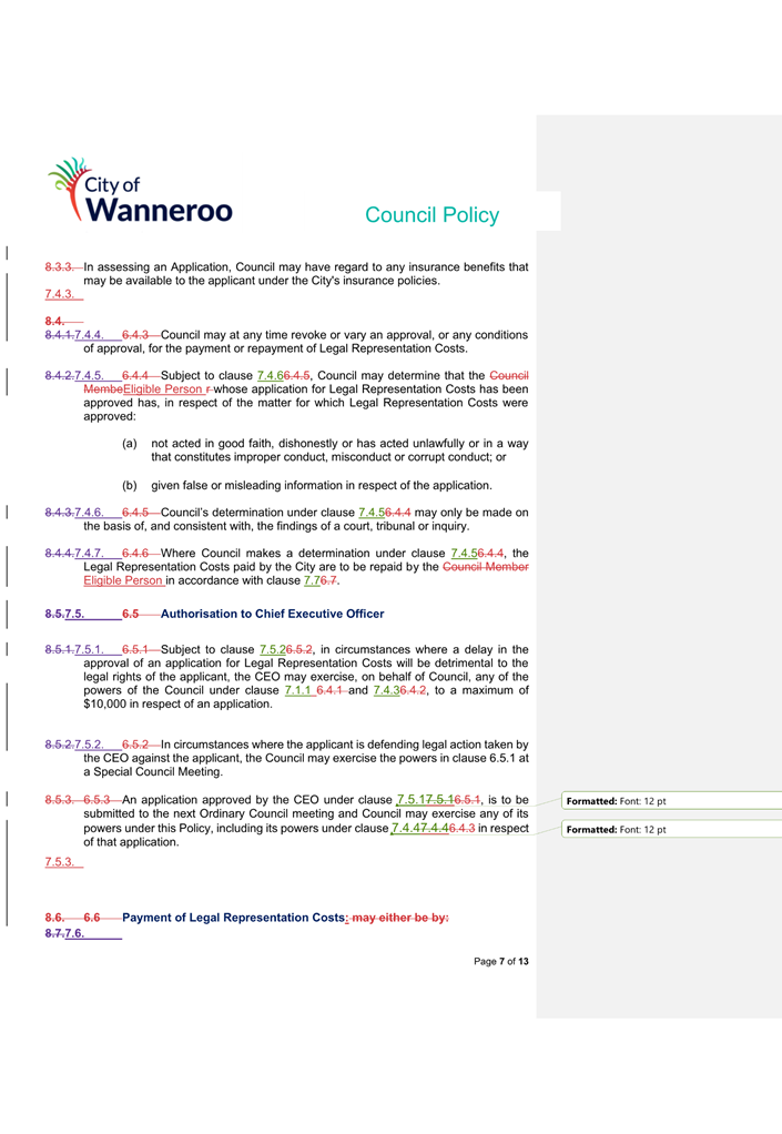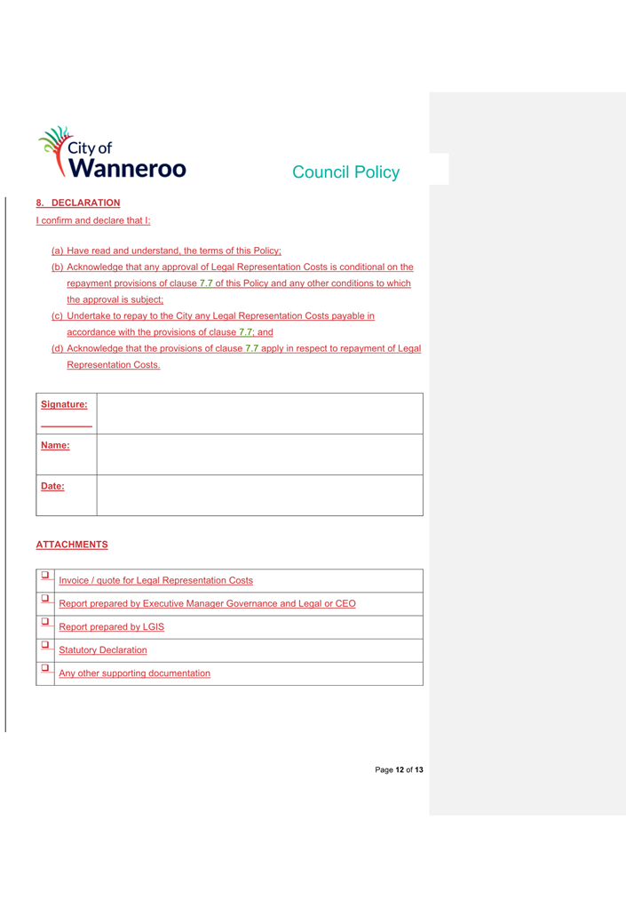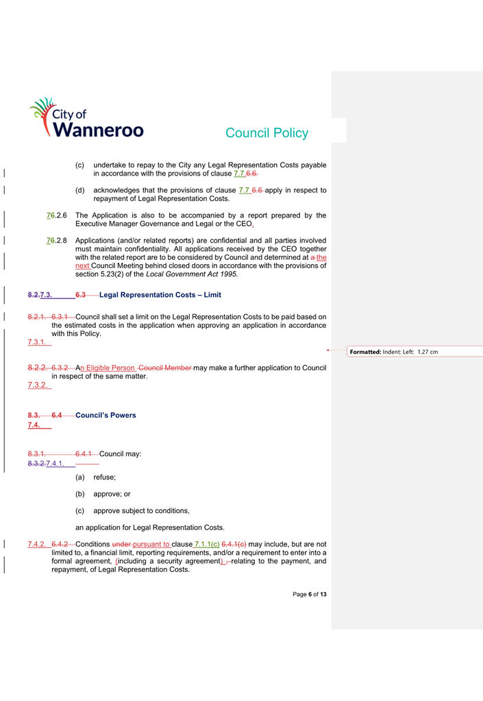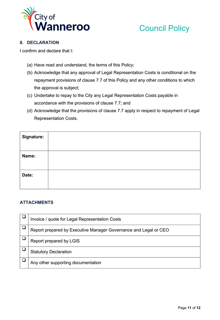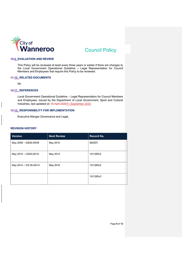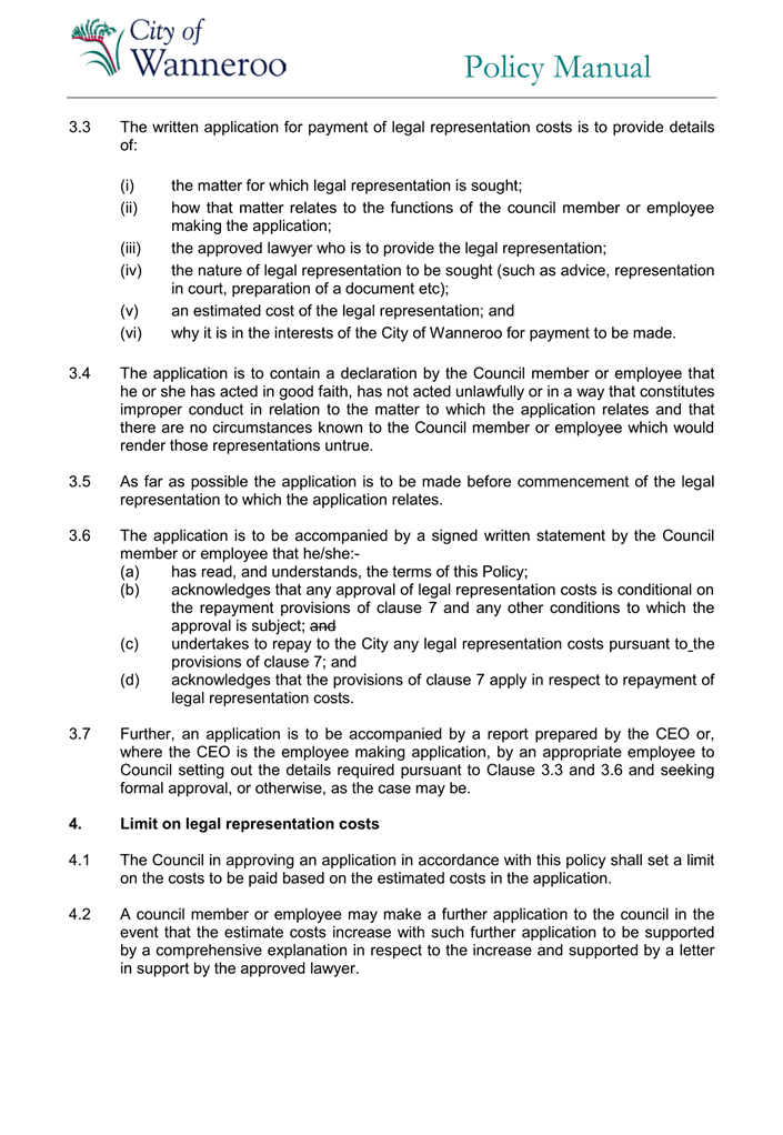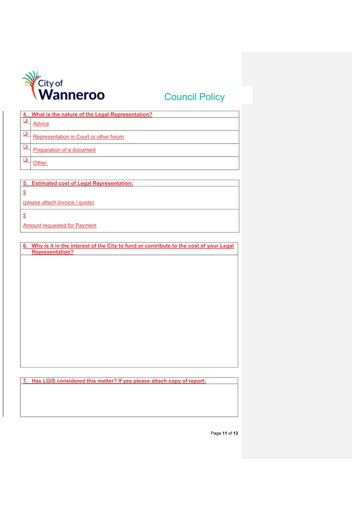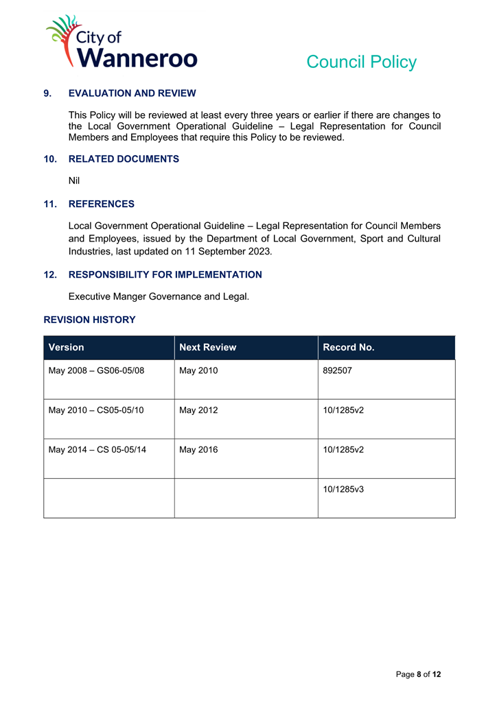 6. Removed references to the legal representation and costs indemnification of Council Employees, who will be dealt with under a separate Corporate Policy. This is a departure from the Model Policy, on the basis that the CEO is the decision-maker in respect of employee matters and is consistent with the CEO’s functions under section 5.41(d) and (g) of the Act.