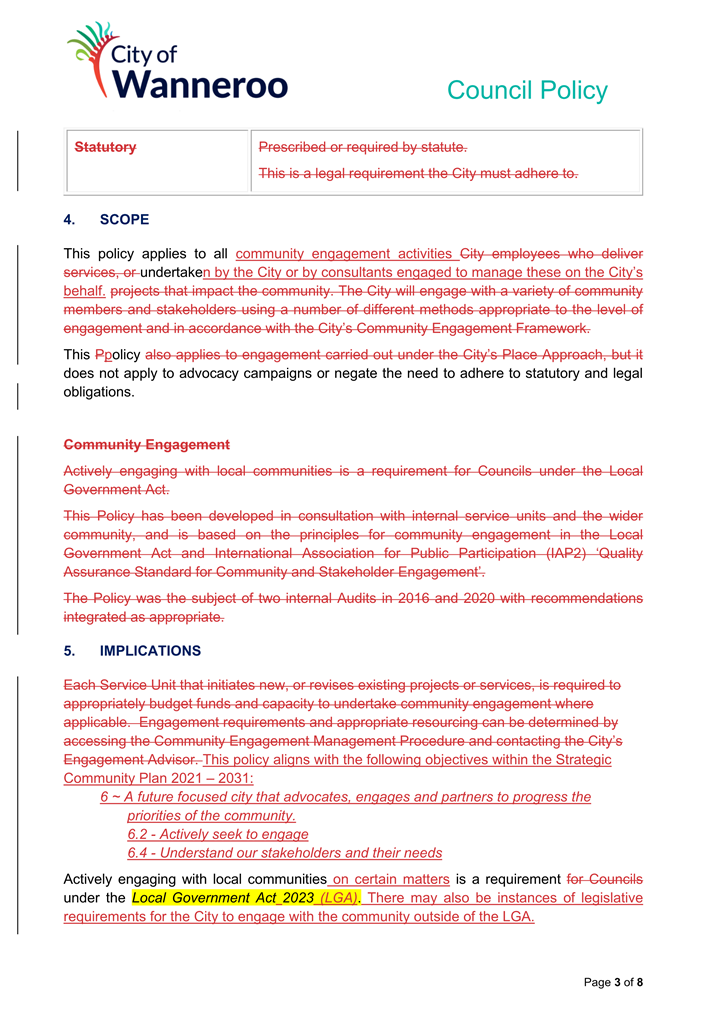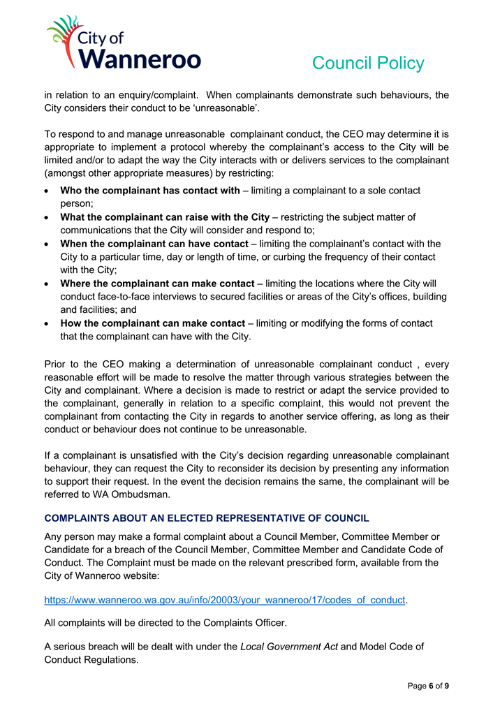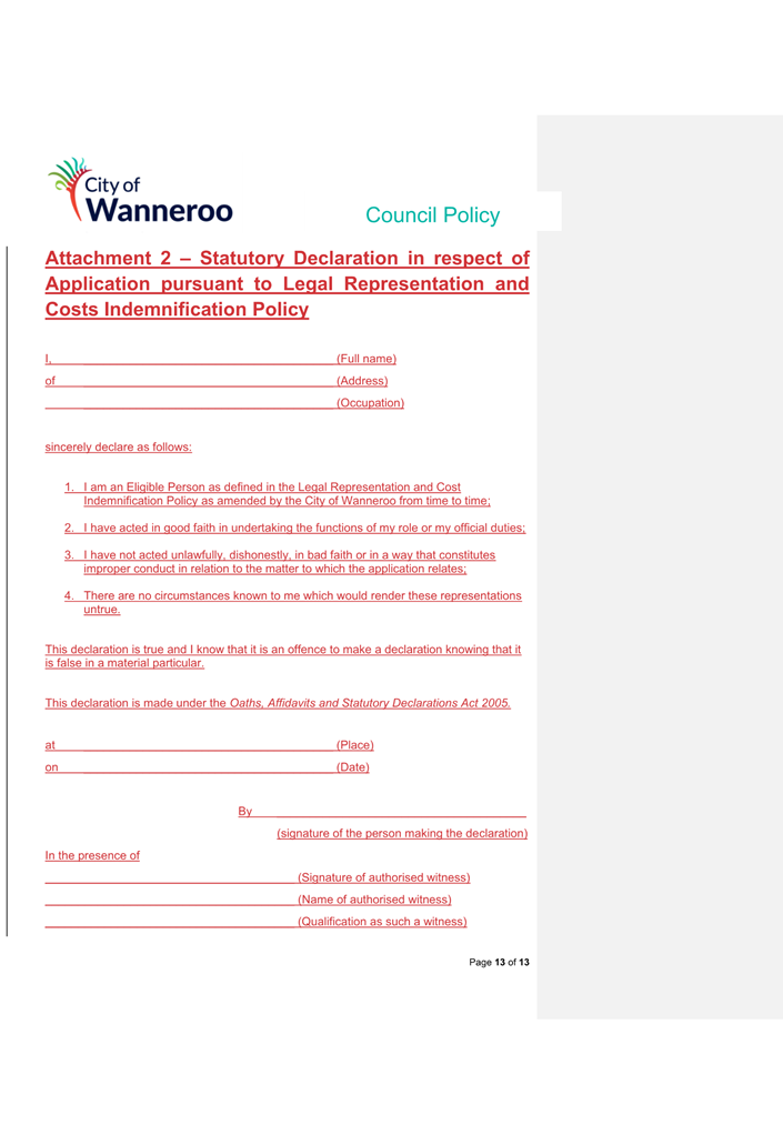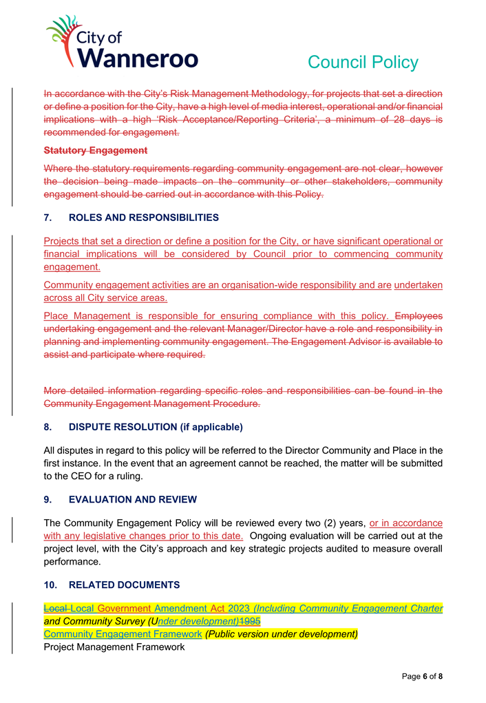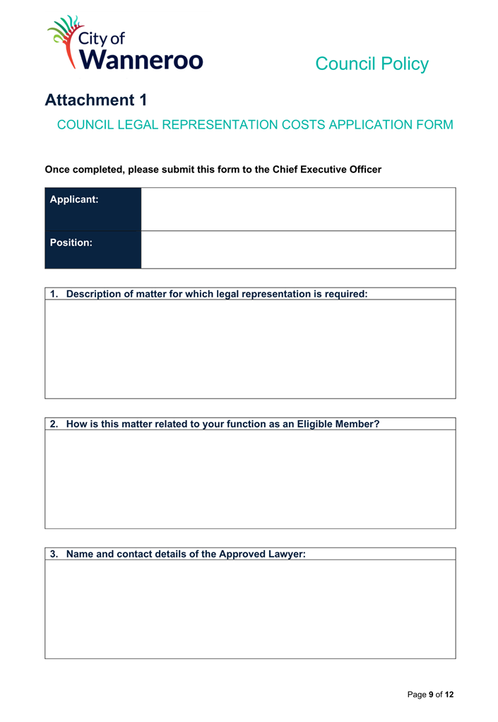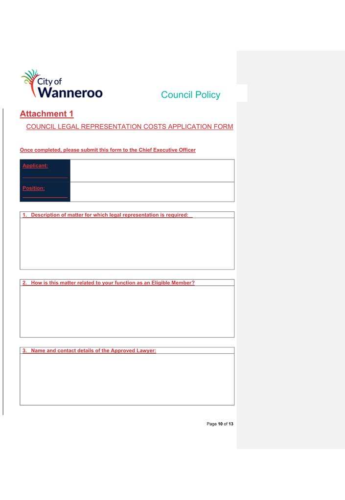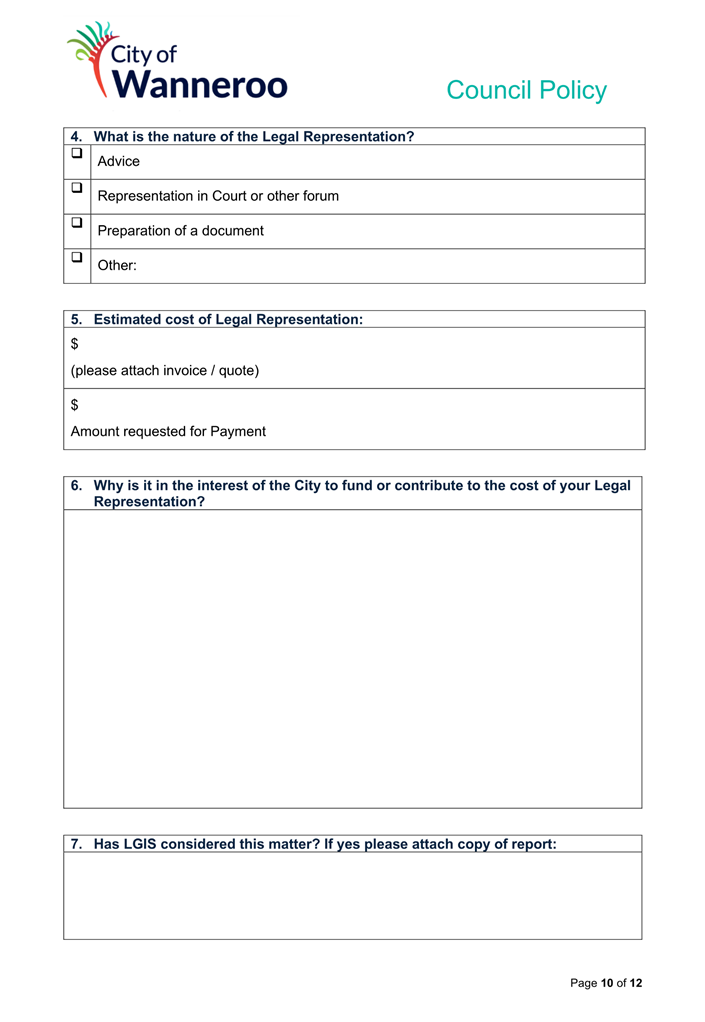 6. Removed references to the legal representation and costs indemnification of Council Employees, who will be dealt with under a separate Corporate Policy. This is a departure from the Model Policy, on the basis that the CEO is the decision-maker in respect of employee matters and is consistent with the CEO’s functions under section 5.41(d) and (g) of the Act.