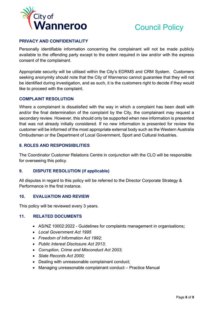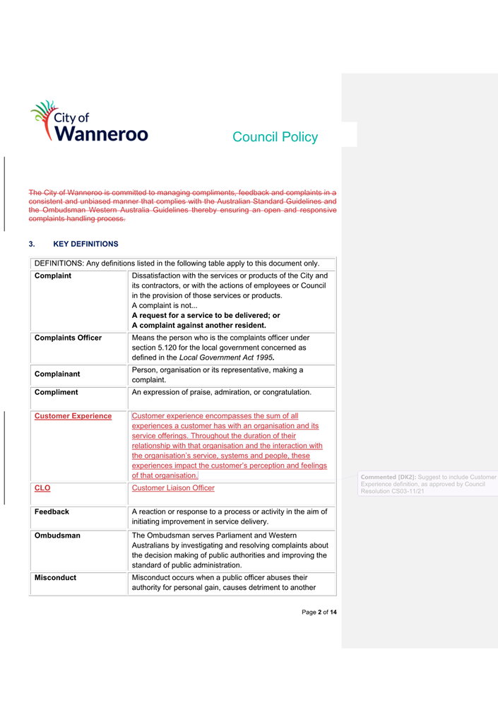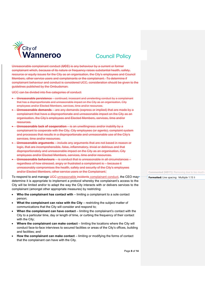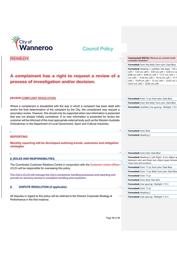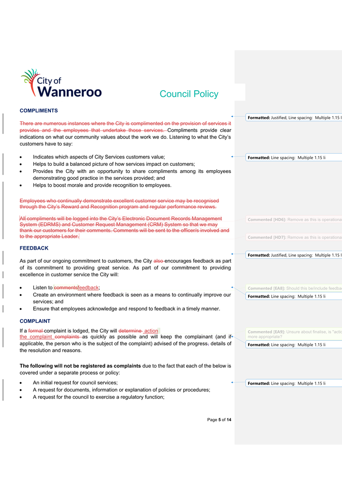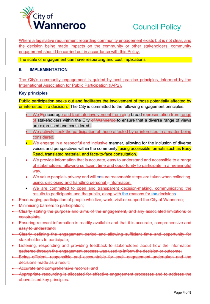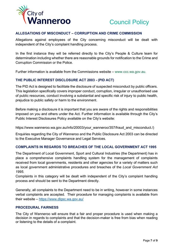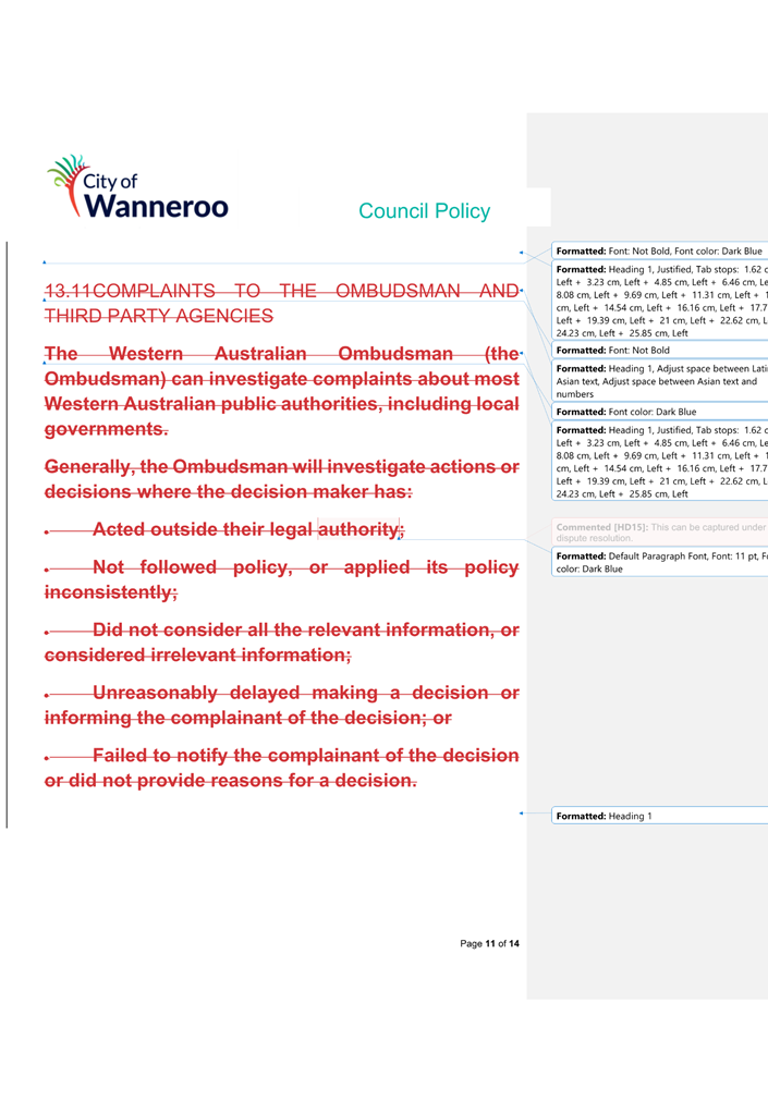 6. Removed references to the legal representation and costs indemnification of Council Employees, who will be dealt with under a separate Corporate Policy. This is a departure from the Model Policy, on the basis that the CEO is the decision-maker in respect of employee matters and is consistent with the CEO’s functions under section 5.41(d) and (g) of the Act.