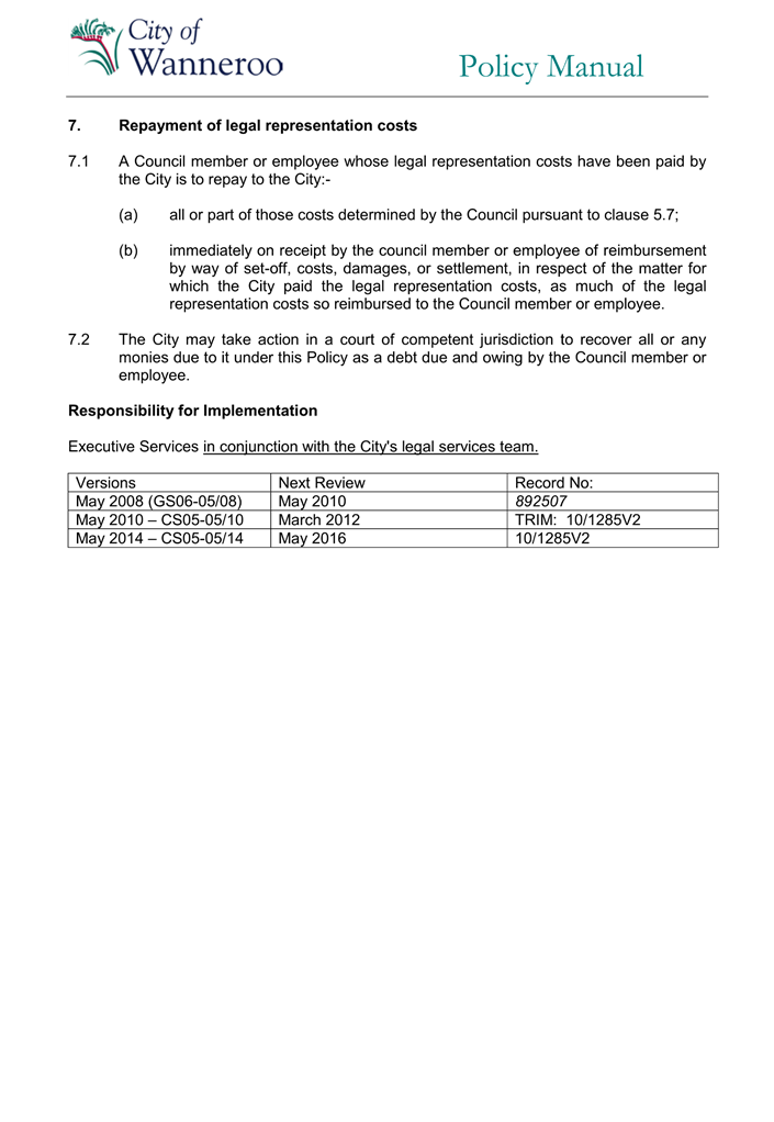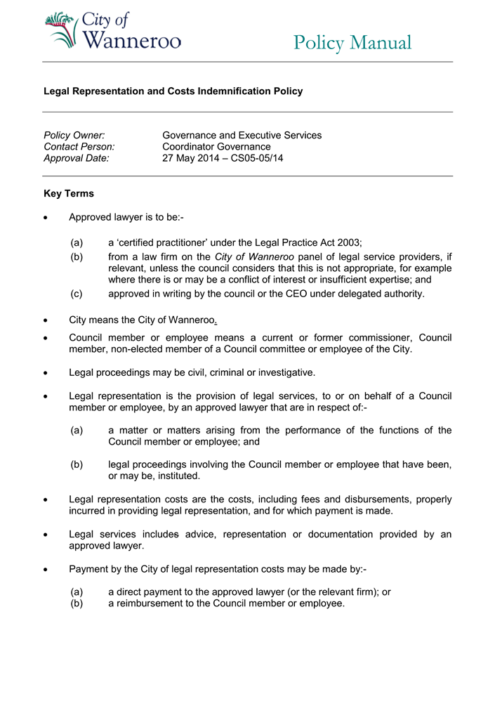 Attachment 1 - 2014 Policy - Legal Representation and Cost Indemnification Policy |