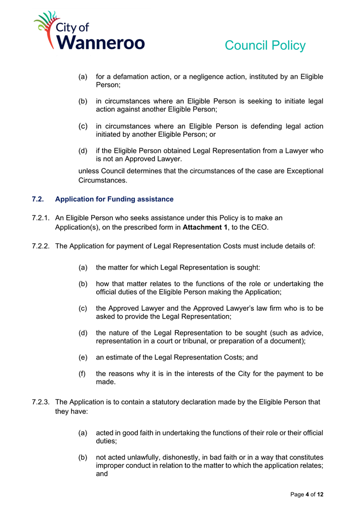 4. Applications for funding or indemnifying Legal Representation Costs will not be supported in circumstances where Council Members seek to initiate or are defending legal action or complaints from other Council Members; and
