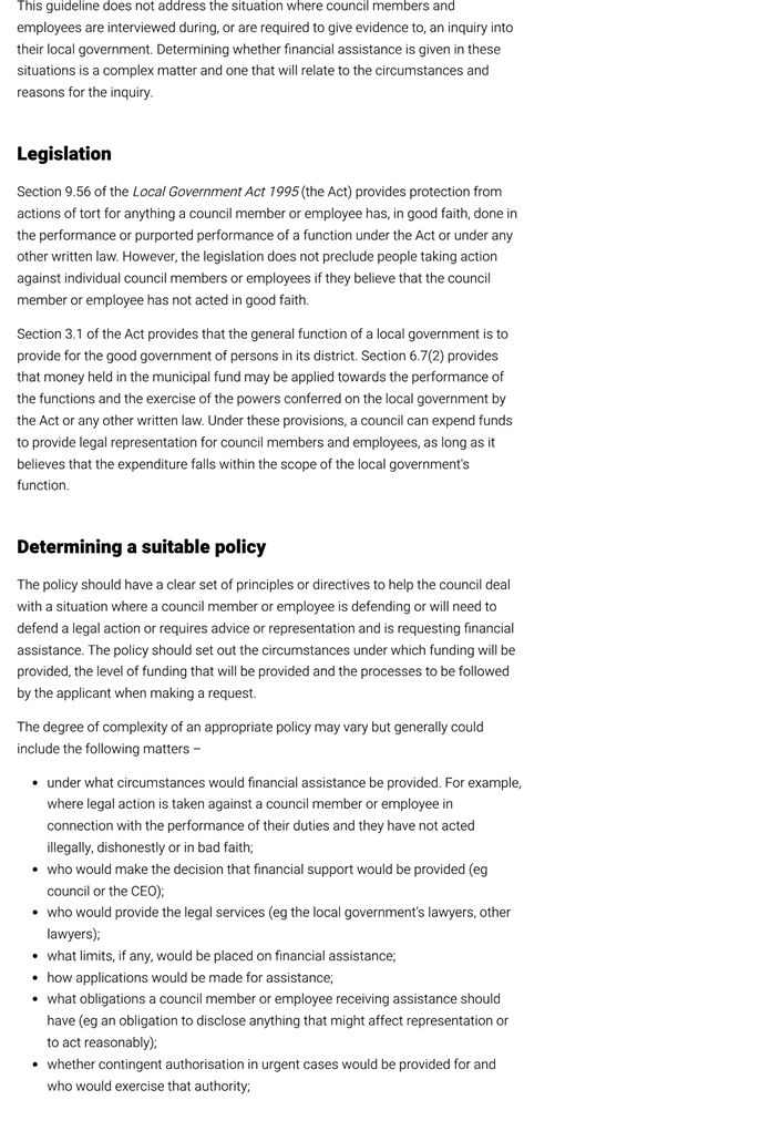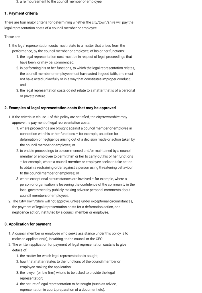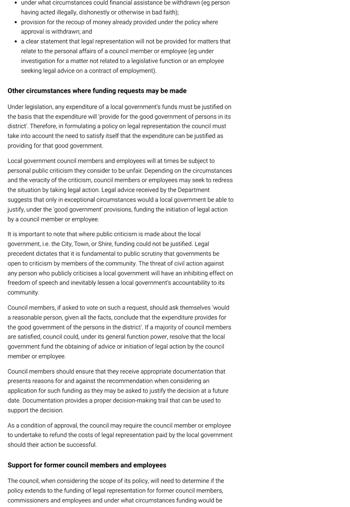 “The policy should have a clear set of principles or directives to help the council deal with a situation where a council member … is defending or will need to defend a legal action or requires advice or representation and is requesting financial assistance. The policy should set out the circumstances under which funding will be provided, the level of funding that will be provided and the processes to be followed by the applicant when making the request.”