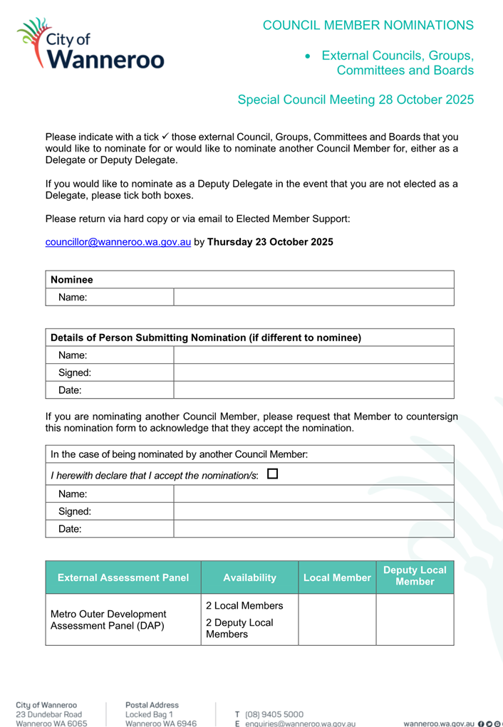 Where there are more nominations than vacancies for representation, a vote will need to be conducted; however, Council has the discretion to amend the Terms of Reference for any City of Wanneroo Advisory Group or Working Group, should Council deem it appropriate to change the representation.