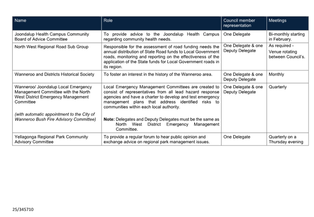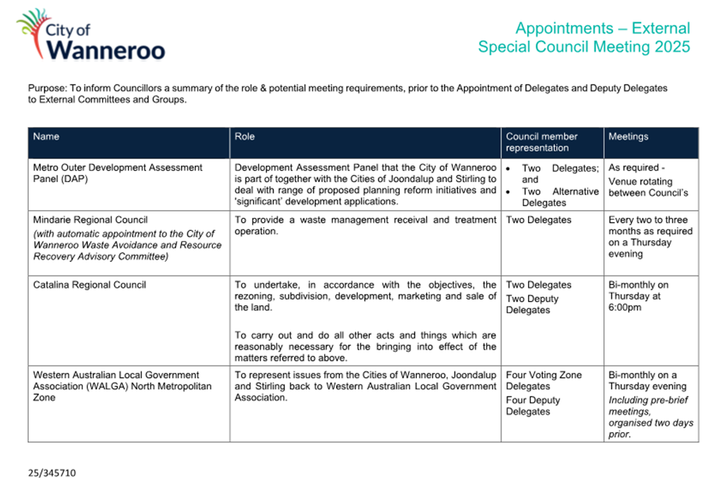 14. CONFIRMS that all appointments remain in effect until the next Ordinary Local Government election day being 16 October 2027, unless otherwise indicated.