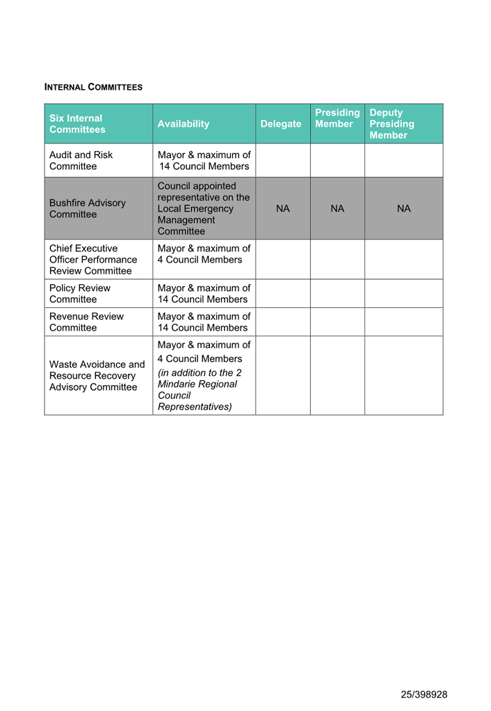 In line with the CEO Performance Contract, the draft Terms of Reference propose that the Committee be comprised of the Mayor and up to four Council Members. Appointment to the Committee requires an absolute majority decision of Council under section 5.10 of the Act.