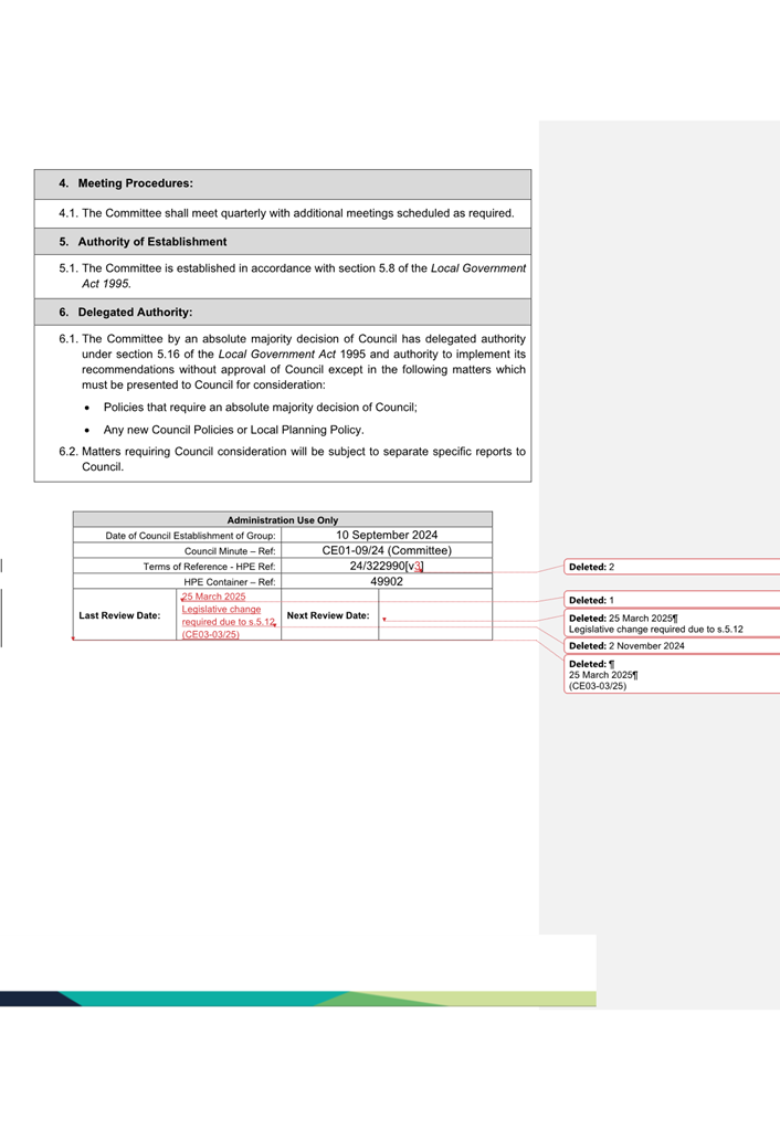 The Committee does not have any delegated authority and must present any recommendation to Council for consideration. All matters presented to the Committee will be conducted in accordance with section 5.23(2) of the Act.