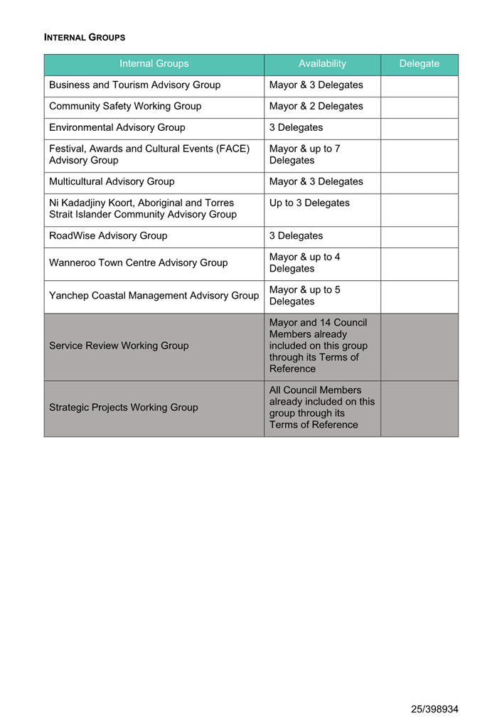 · The Mayor and all Councillors form the membership of the Service Review Working Group and the Strategic Projects Working Group in accordance with each Groups Terms of Reference. Therefore, both Groups have not been included in this report to seek appointments.